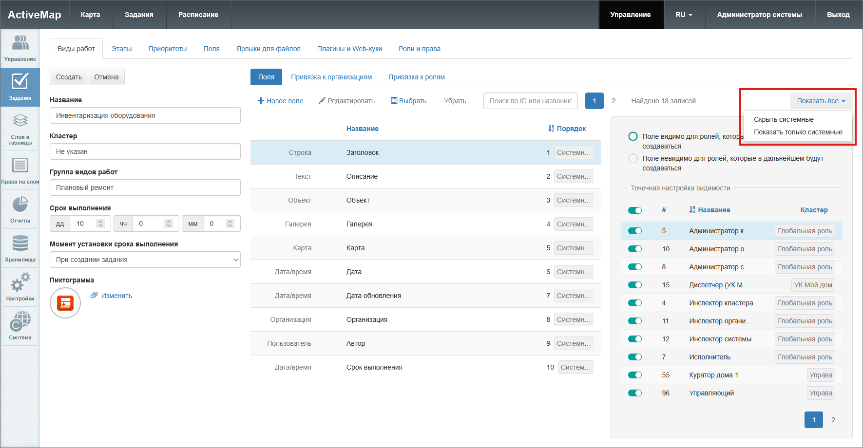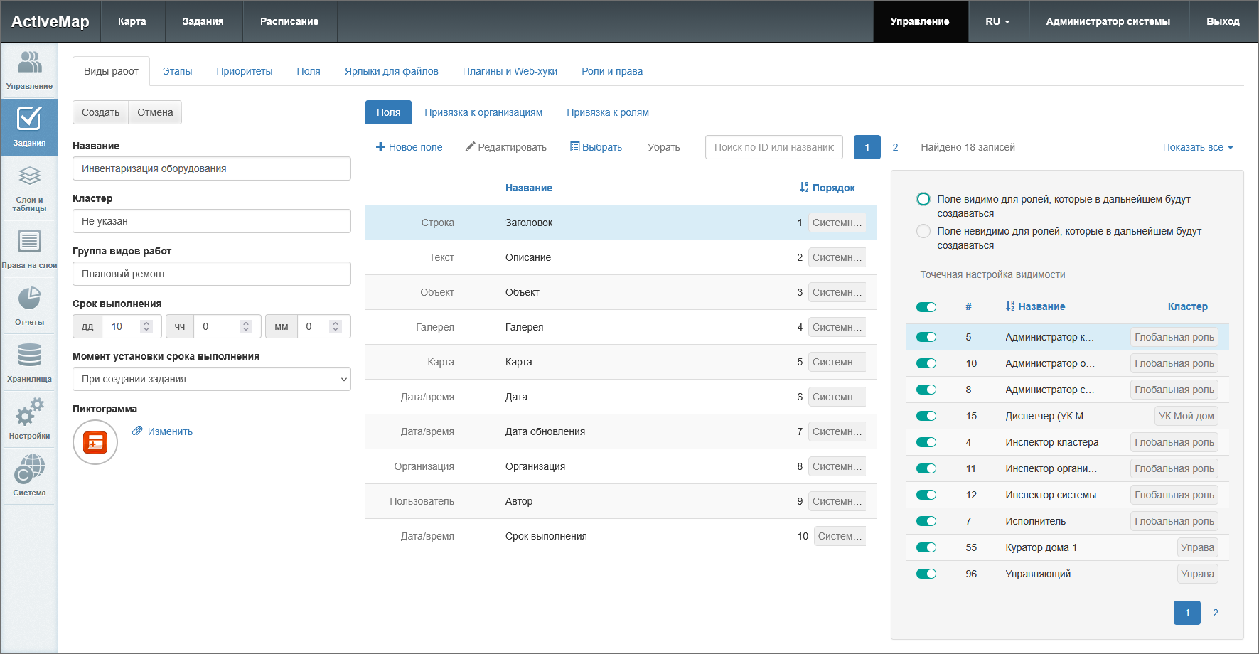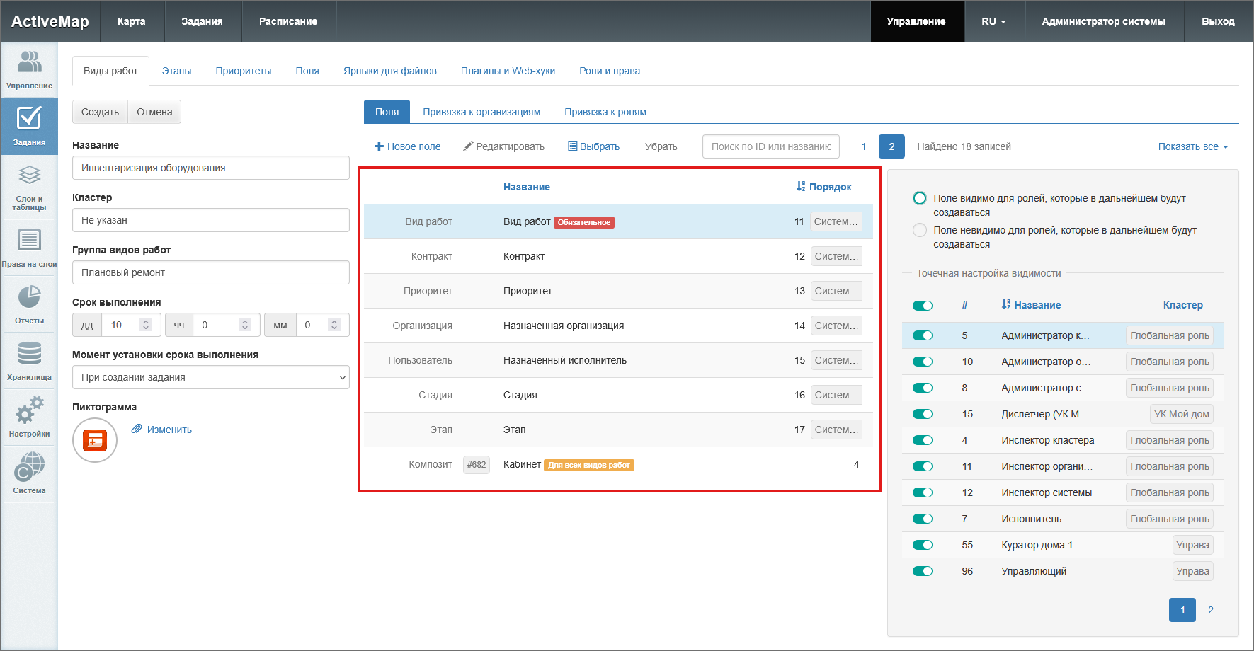 Данная вкладка используется для настройки списка полей, отображаемого в карточке задания при выборе данного вида работ. Здесь можно просматривать, создавать и редактировать поля, а также настраивать видимость в зависимости от роли пользователей (Рис. 2.85).