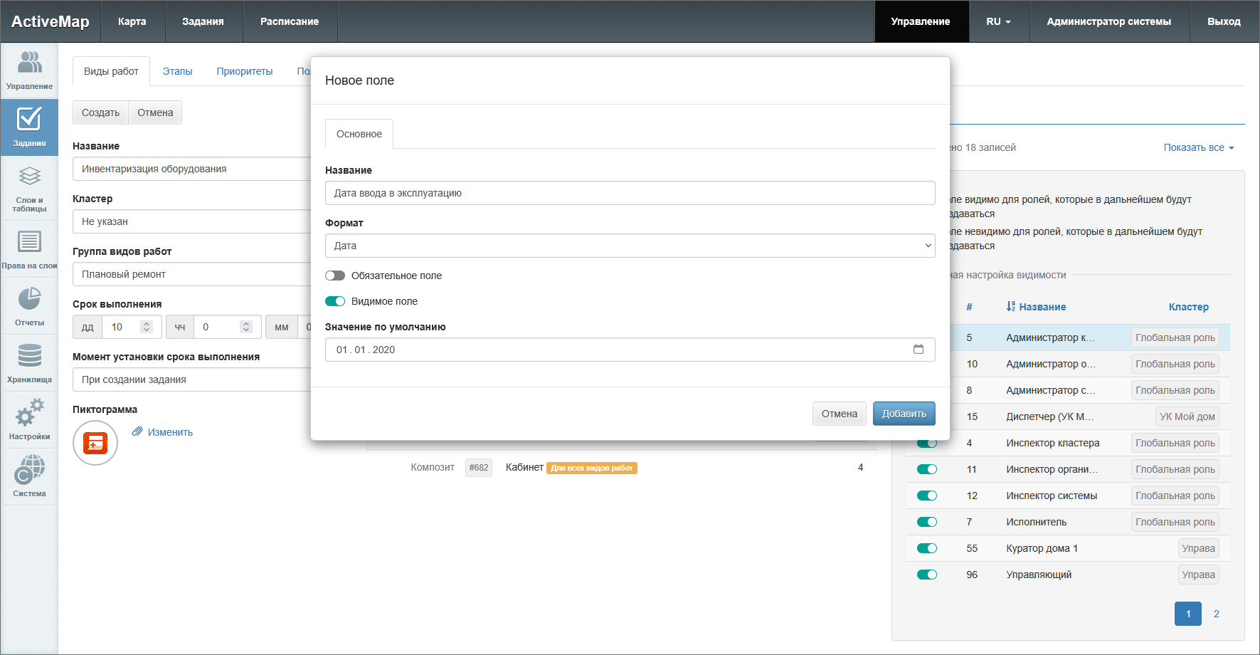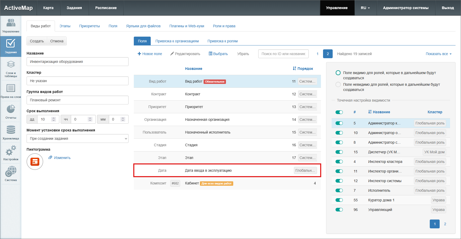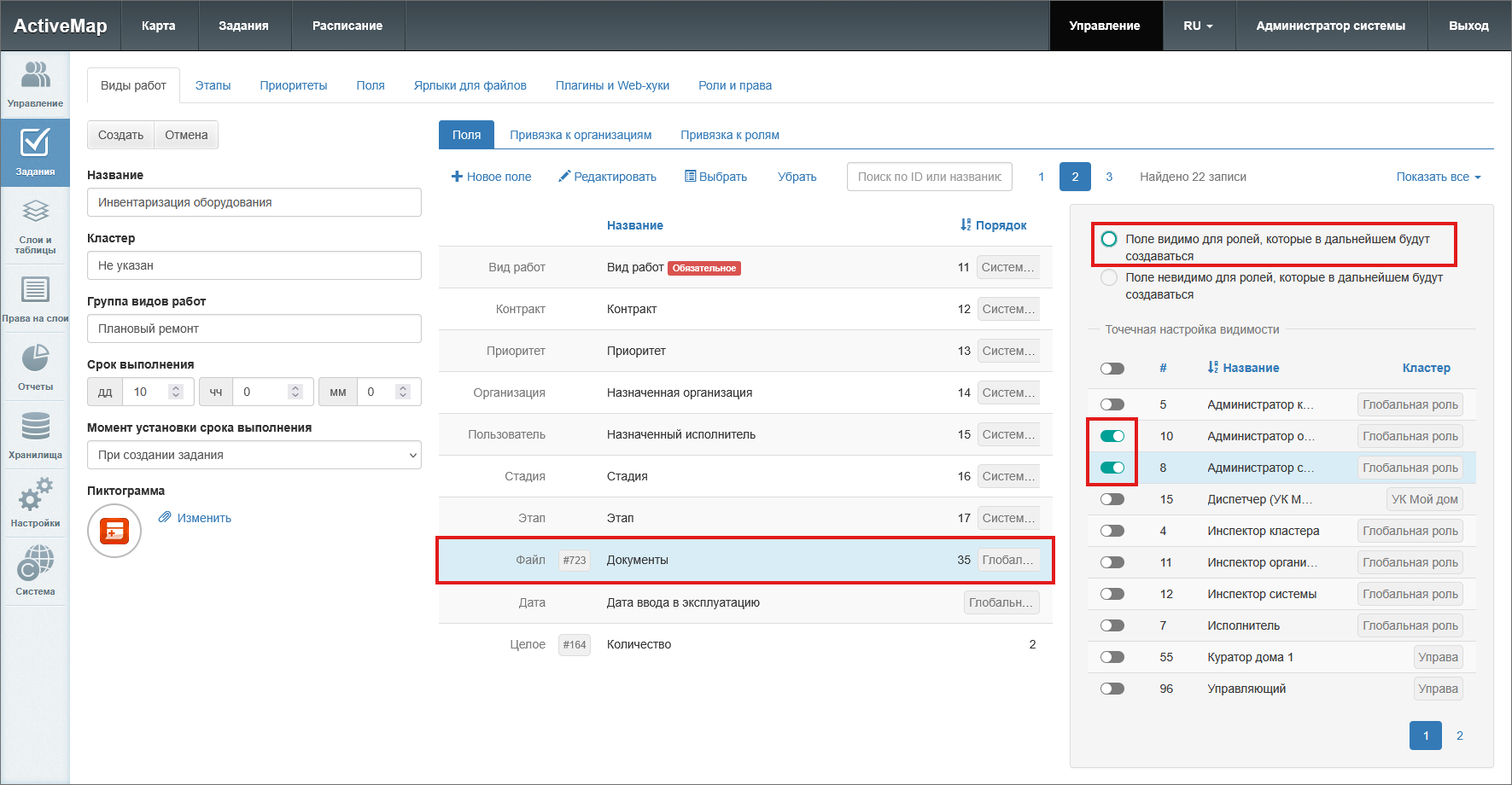 панель «Настройка видимости поля» – позволяет настроить отображение поля для выбранного вида работ для указанных ролей. Активация тумблера «Поле видимо по умолчанию» делает данное поле доступным для всех вновь создаваемых ролей.