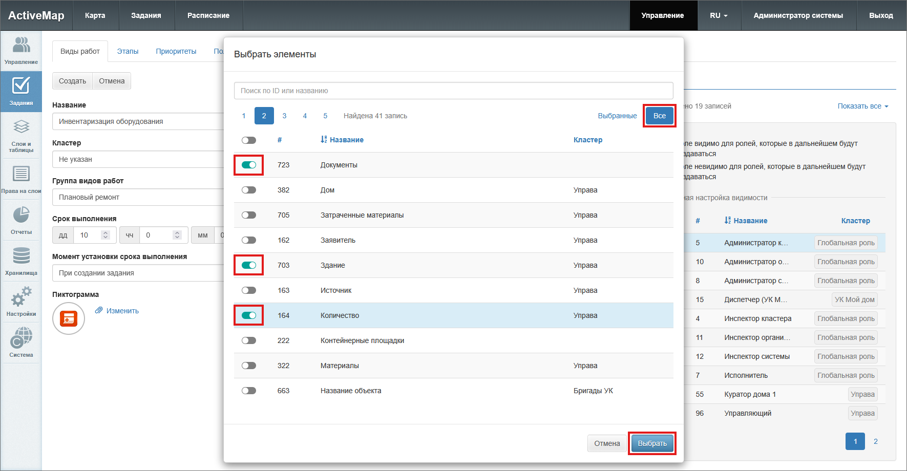 тумблеры с названиями отдельных ролей – делает вид работ доступным для выбранных ролей.