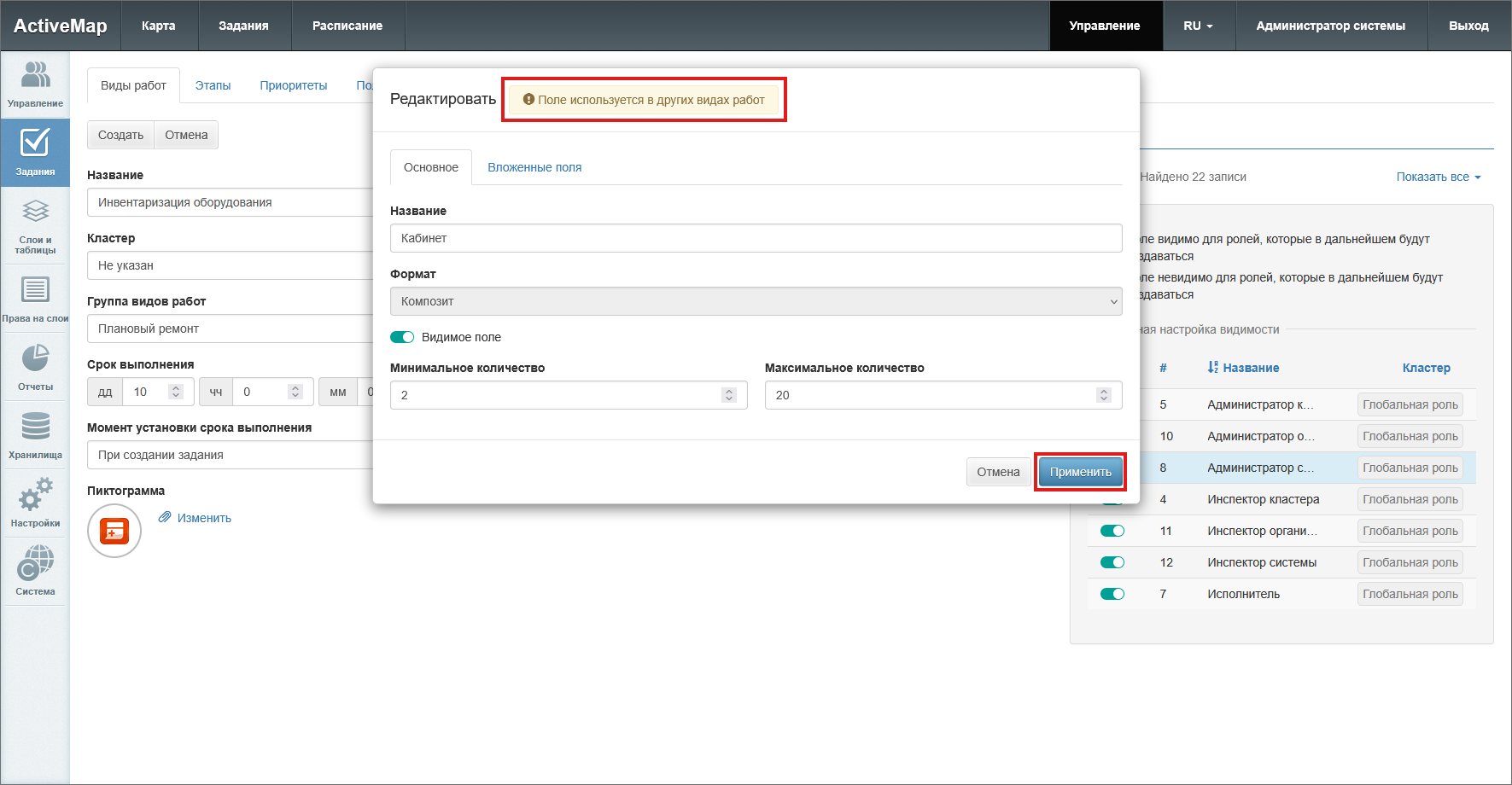 Для изменения поля следует нажать «Редактировать», внести правки и нажать «Применить» (Рис. 2.92). Если для поля активирована опция «Для всех видов работ», то внесенные изменения будет применены ко всем видам работ.