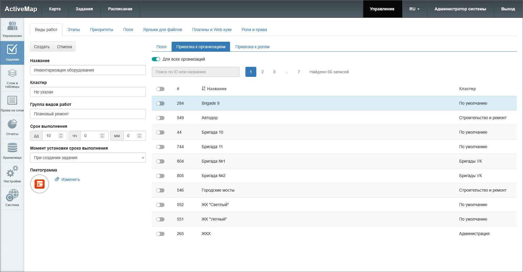 тумблеры с названиями отдельных организаций – делает вид работ доступным для выбранных организаций.