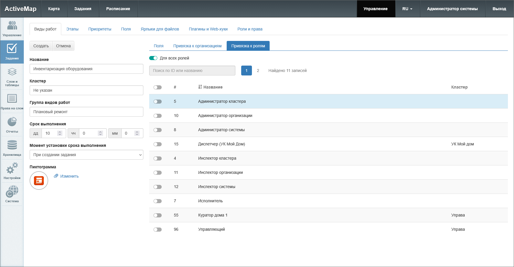 тумблер «Для всех ролей» – делает вид работ доступным для всех ролей в системе (для глобальных видов работ) или внутри кластера (для локальных видов работ);