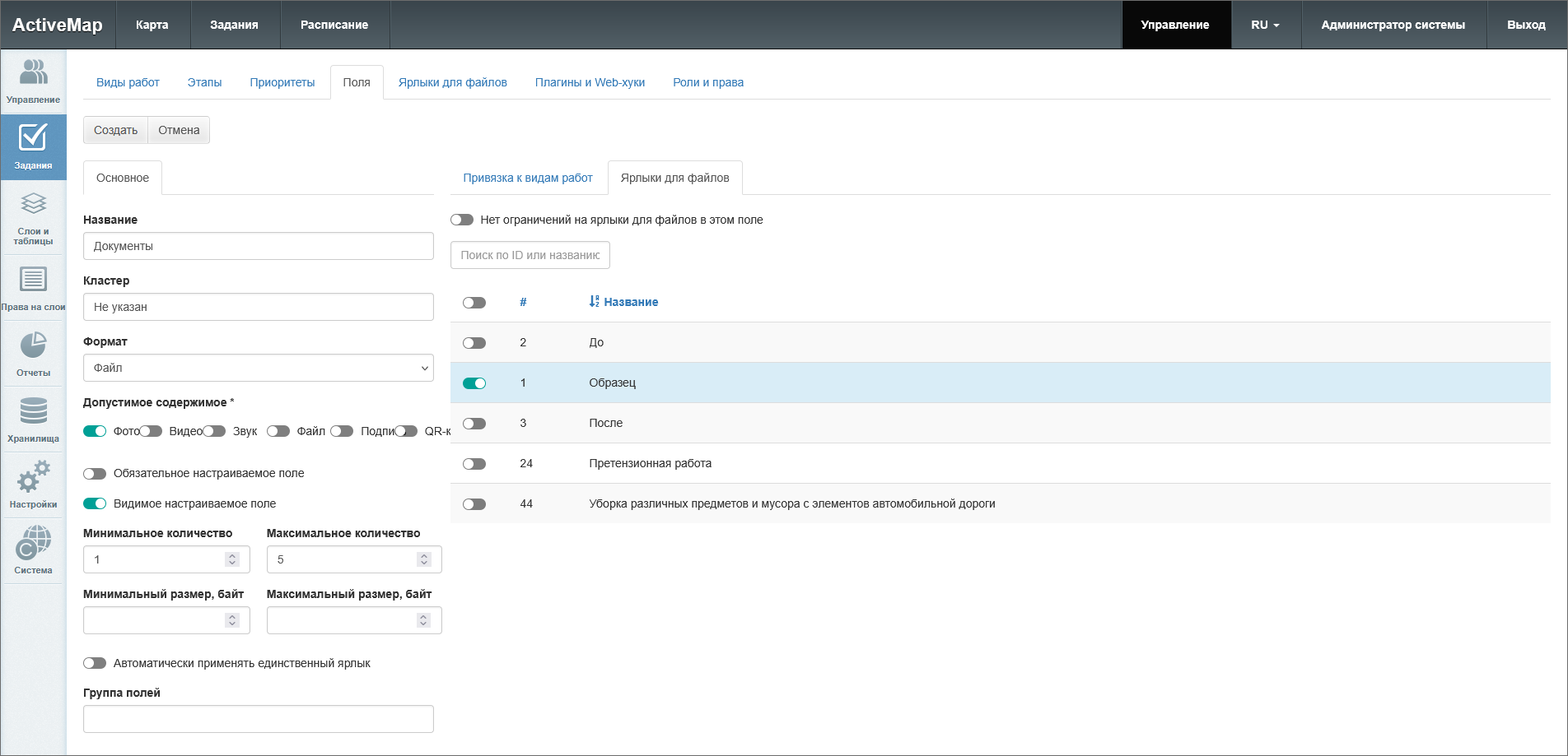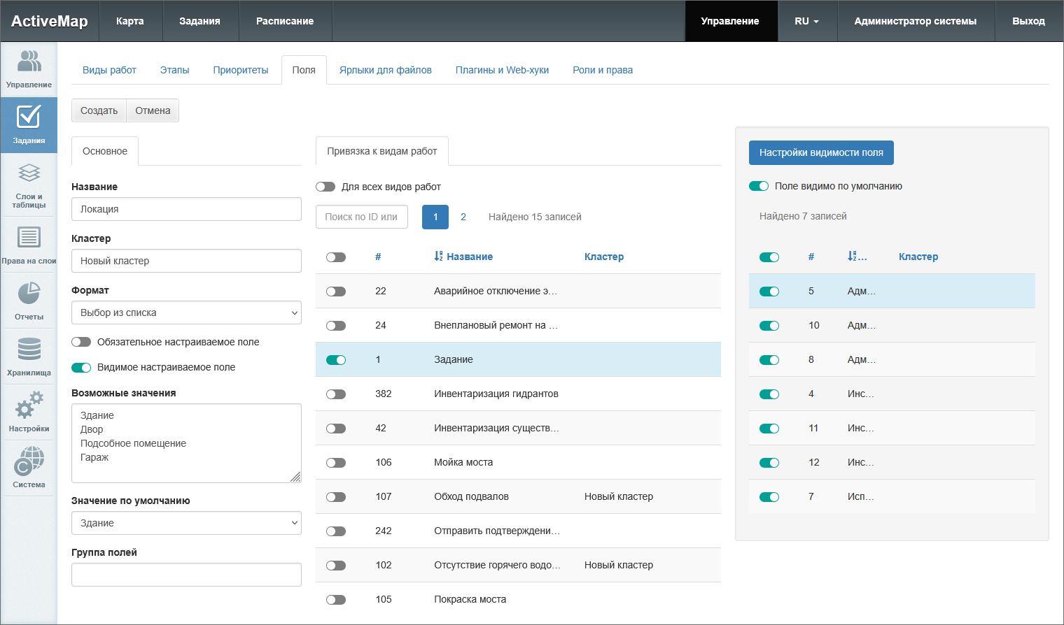 тумблер «Для всех видов работ» – делает поле доступным для всех видов работ в системе (глобальные настраиваемые поля) или внутри кластера (локальные настраиваемые поля);