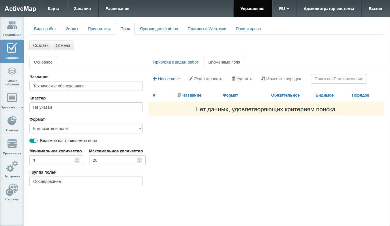 Для композитных полей следует указать минимальное и максимальное количество экземпляров, которое пользователь может добавить в карточке задания. Композитное поле нельзя сделать обязательным, нельзя установить для него значение по умолчанию. Для композитного поля необходимо создать вложенные поля в одноименной вкладке.