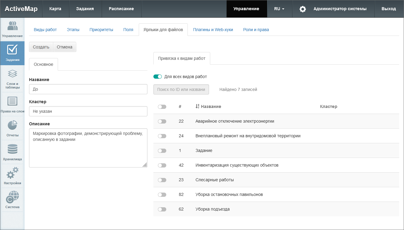 тумблер «Для всех организаций» – делает вид работ доступным для всех организаций в системе (для глобальных видов работ) или внутри кластера (для локальных видов работ);