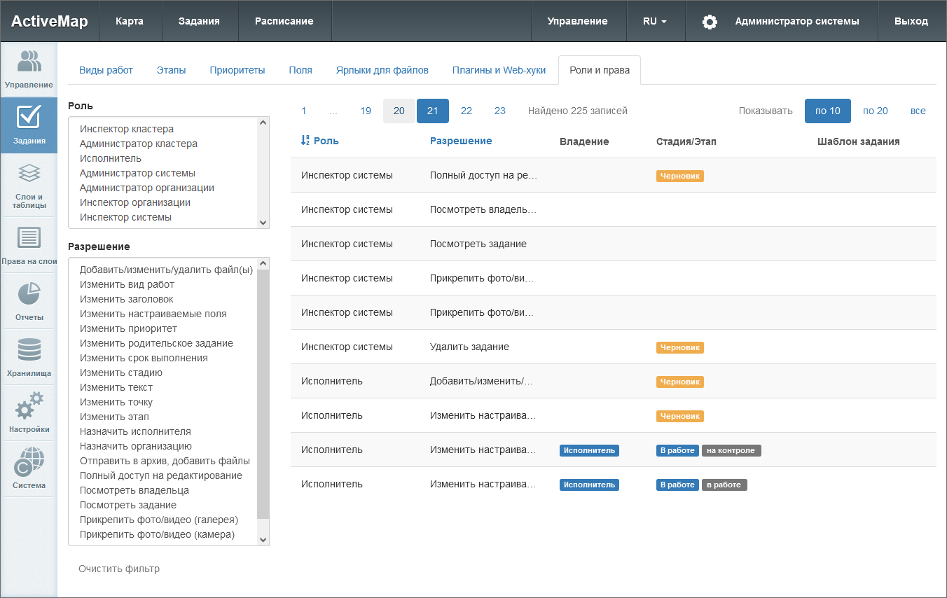 Для просмотра прав определенной роли нужно выбрать ее в окне «Роли». В списке в правой части экрана отобразятся разрешения для данной роли. Для того чтобы просмотреть роли, обладающие определенным разрешением, нужно выбрать его в окне «Разрешения». Результат отобразится в списке в правой части экрана. Кнопка «Очистить фильтр» сбрасывает выбор роли и разрешения, в результате в списке отображаются все роли и все права.