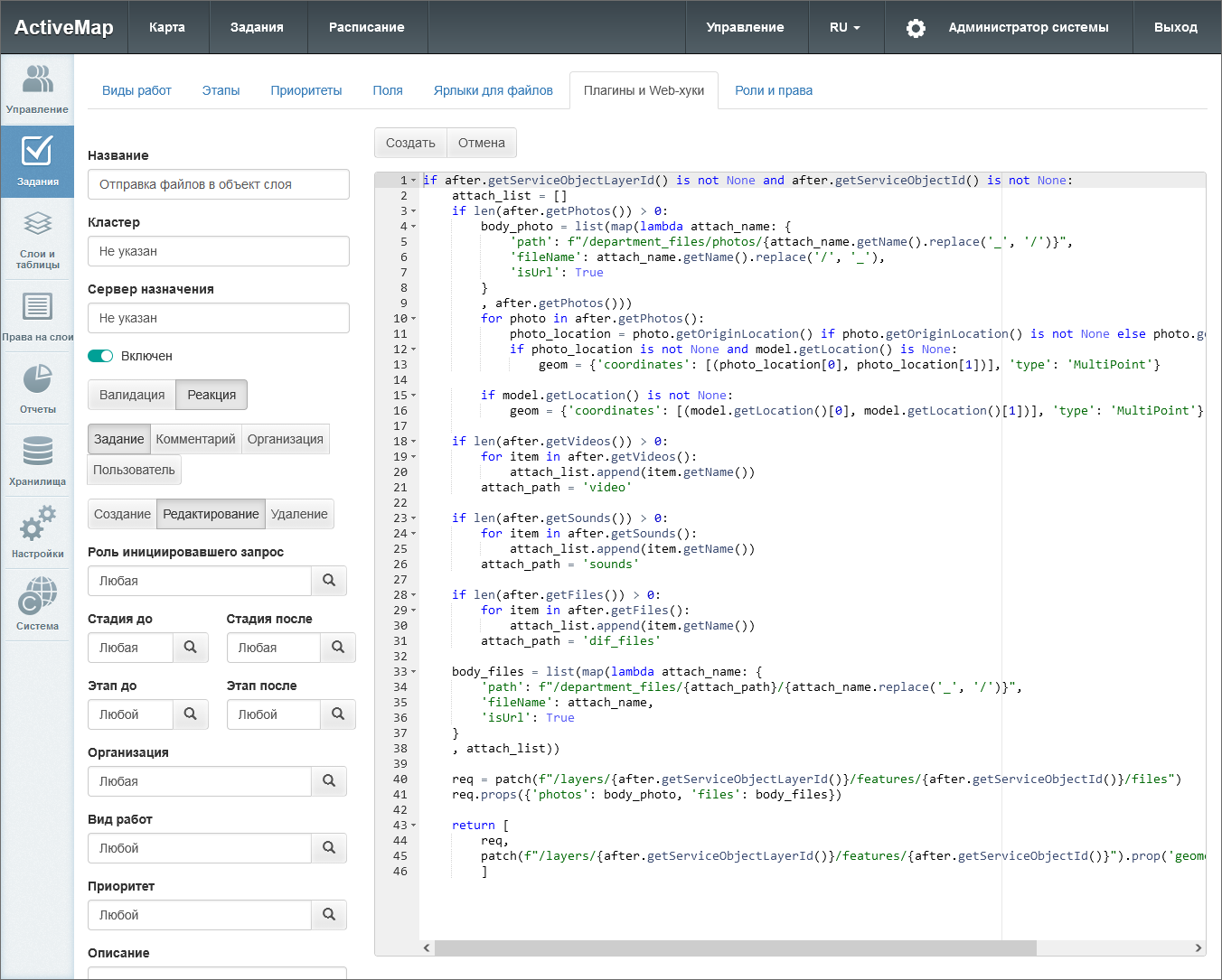 В поле справа нужно написать скрипт на языке Python. Роли, стадии и этапы до/после, организации, виды работ и приоритеты можно прописать непосредственно в скрипте в более сложных сочетаниях, чем позволяет обычное включение тумблеров в левой части окна. Если данные поля упоминаются в скрипте, в левой части можно оставить для них значения по умолчанию – «любая/любой».