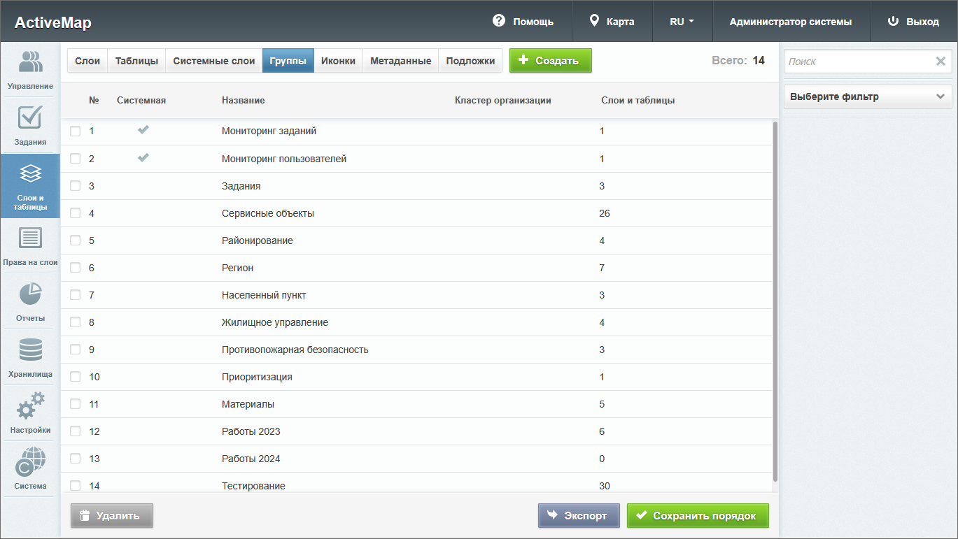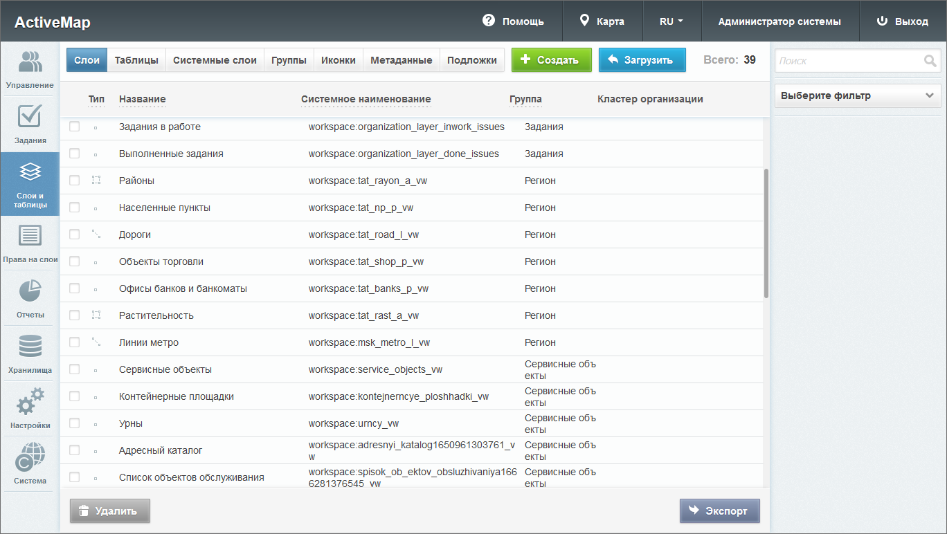 При переходе во вкладку «Слои» администратор может воспользоваться поисковой строкой и фильтрами (по группе, хранилищу данных, типу геометрии, принадлежности к растровым слоям, по объектам заданий и кластеру), а также инструментами для создания новых слоев и редактирования/удаления уже существующих.