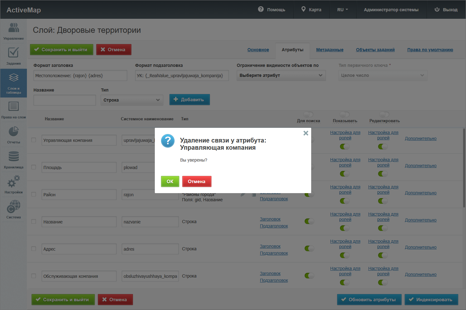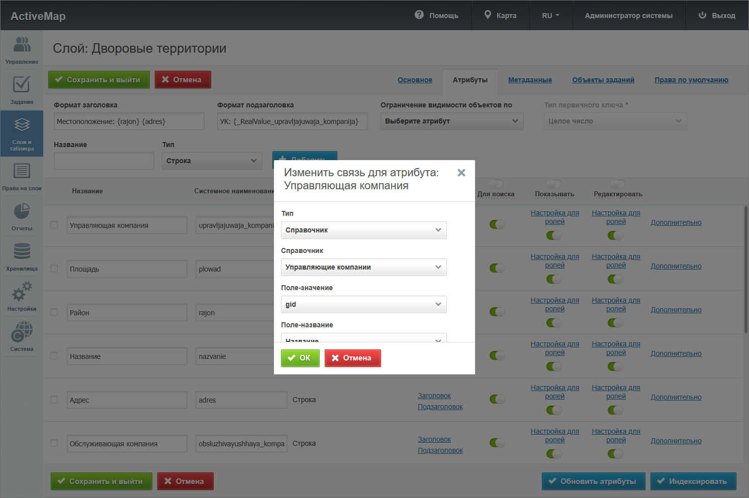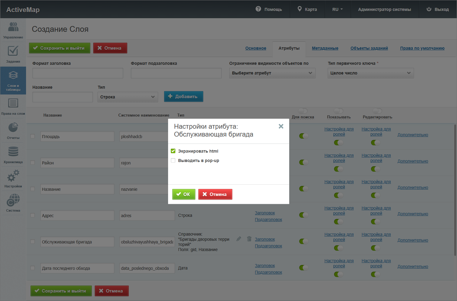 «Выводить в pop-up» – отмечает те поля, которые должны отображаться в карточке объекта, которая выводится при клике по объекту на карте.