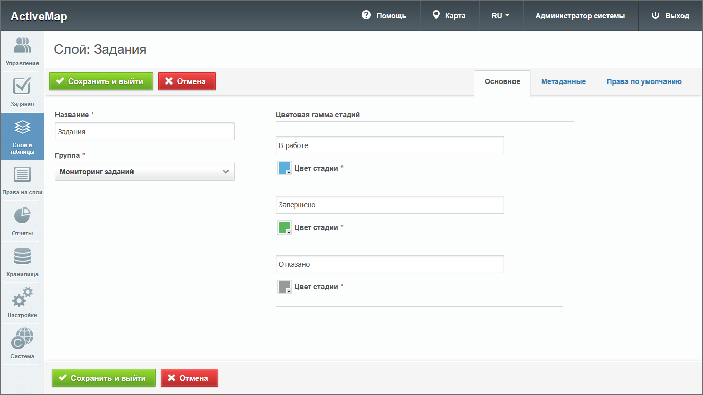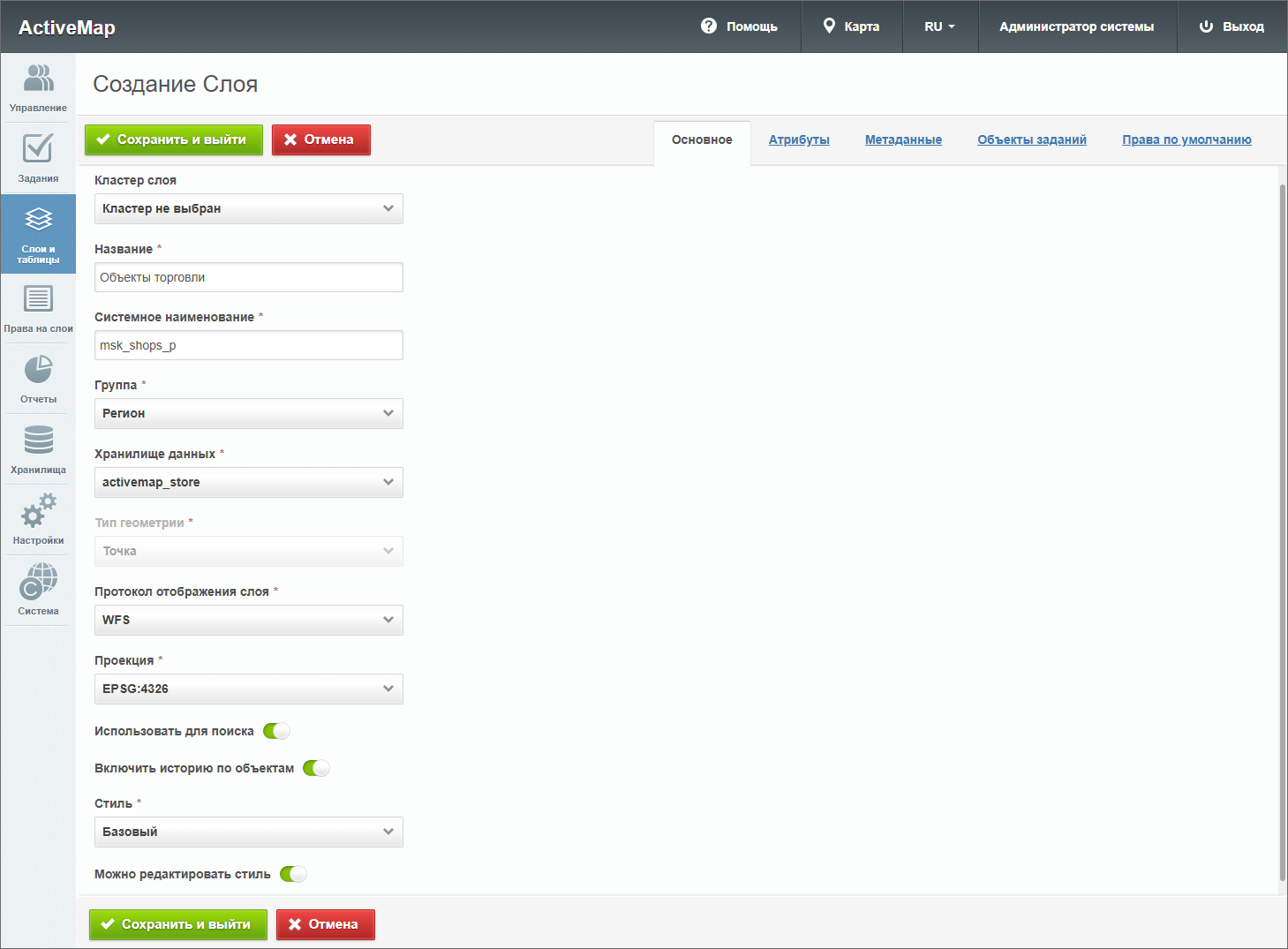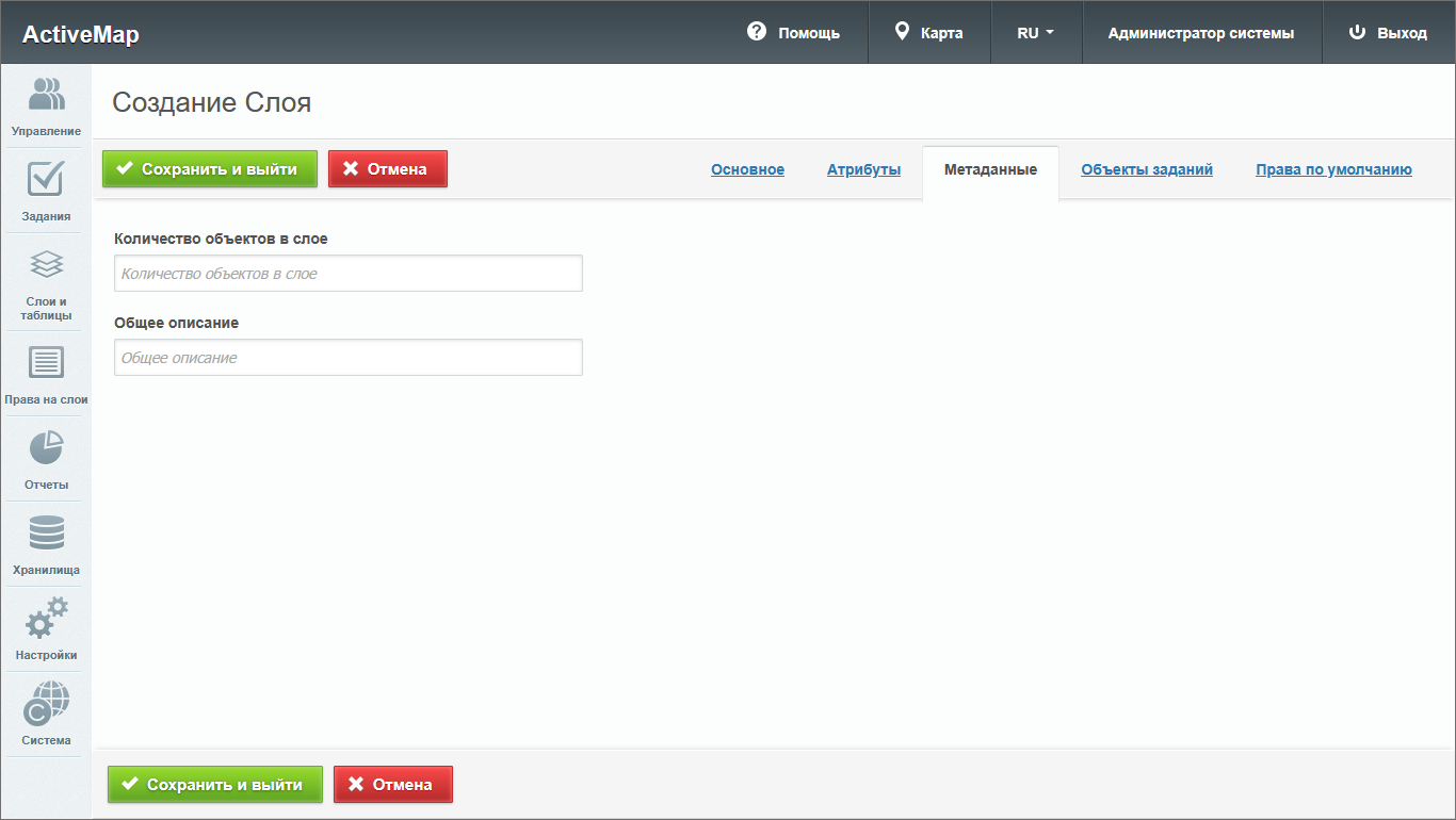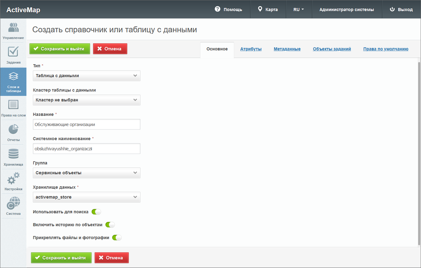 – откроется окно создания слоя, содержащее вкладки: «Основное», «Атрибуты», «Объекты заданий» и «Права по умолчанию». Дополнительно может присутствовать вкладка «Метаданные».