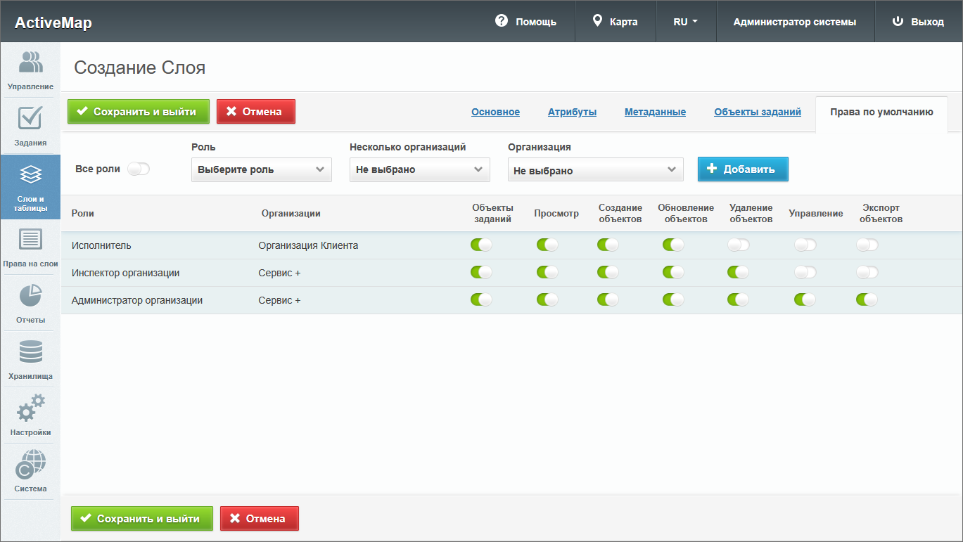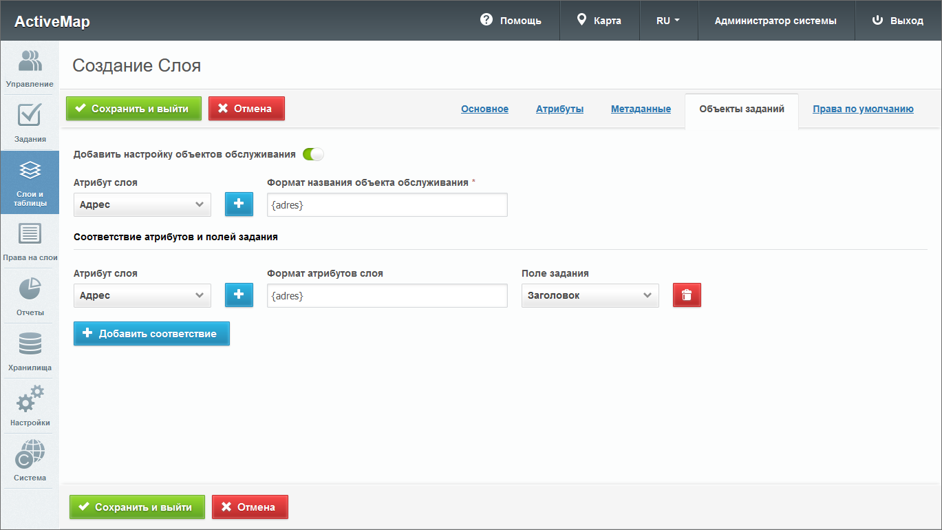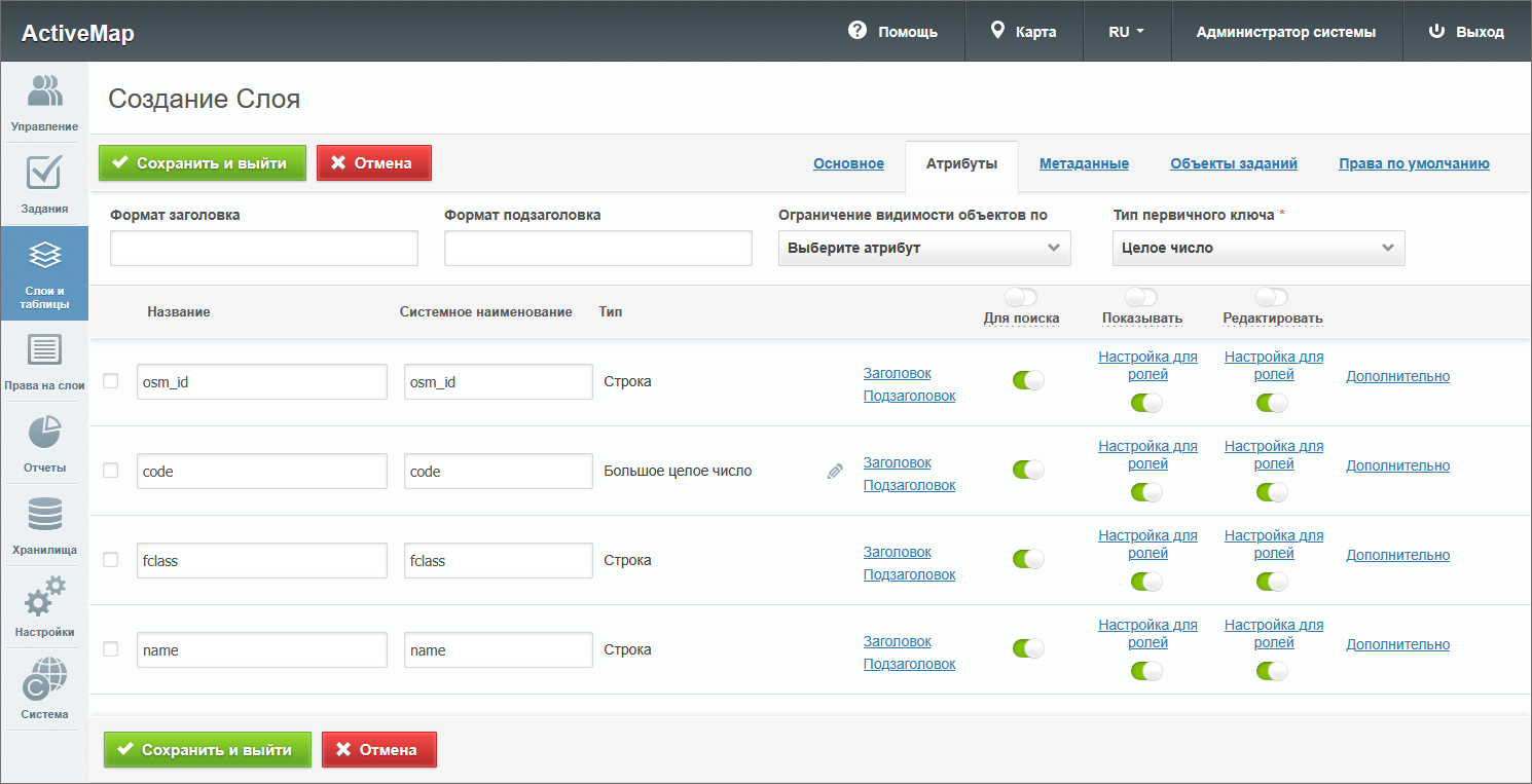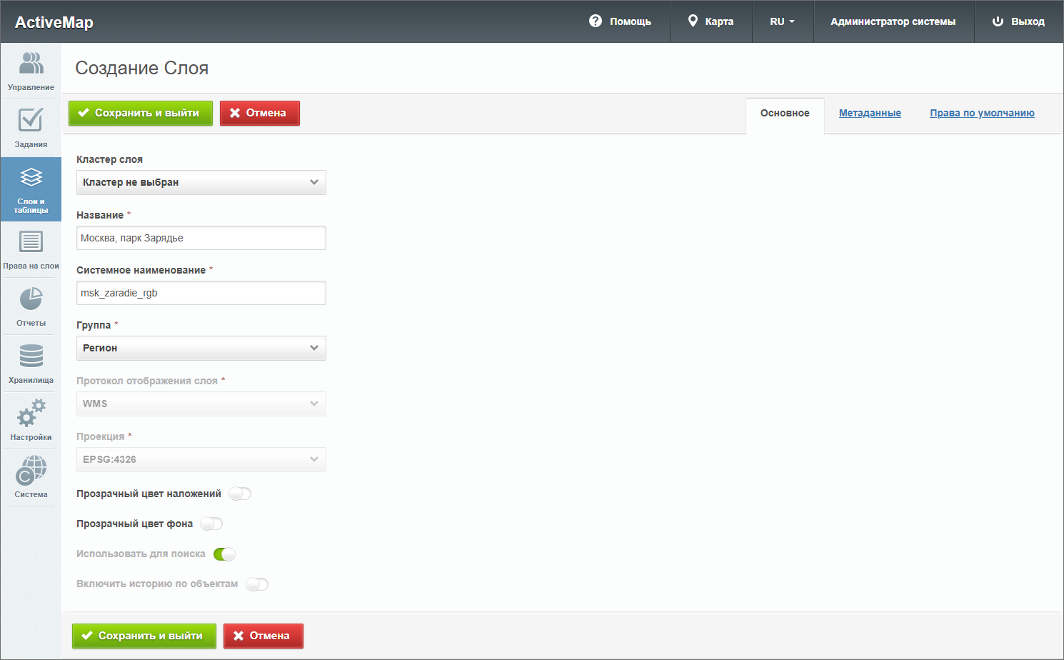 – откроется окно создания слоя, содержащее вкладки: «Основное», «Атрибуты», «Объекты заданий» и «Права по умолчанию». Дополнительно может присутствовать вкладка «Метаданные».