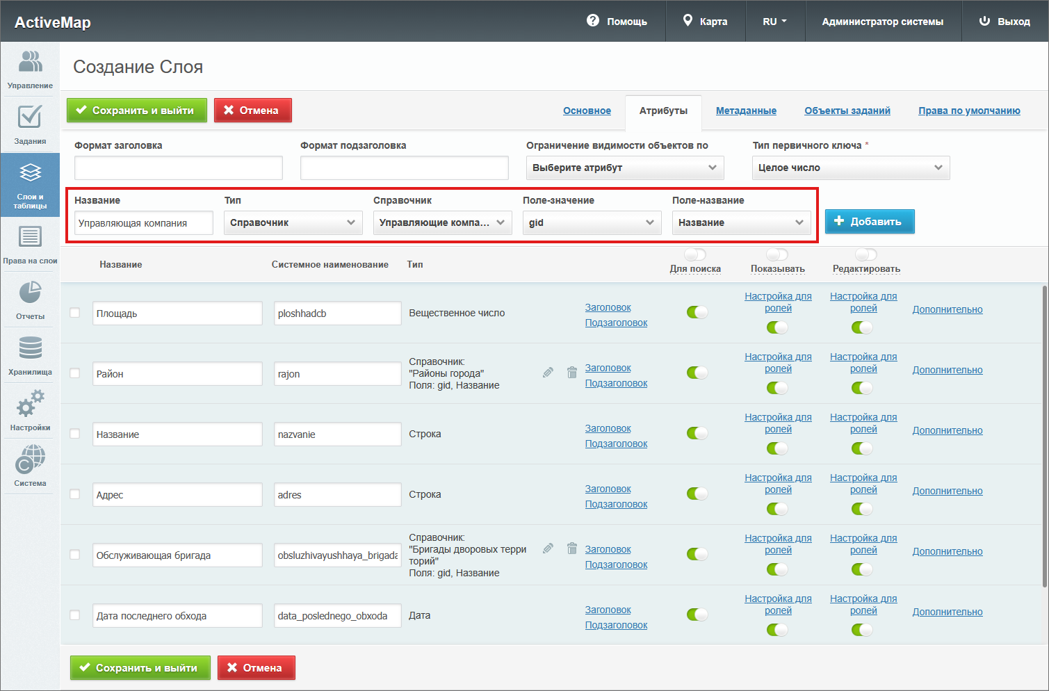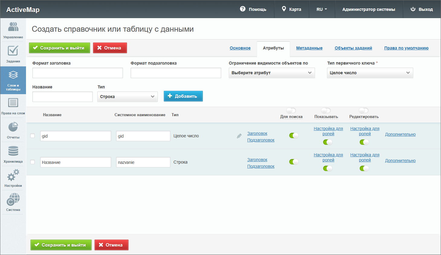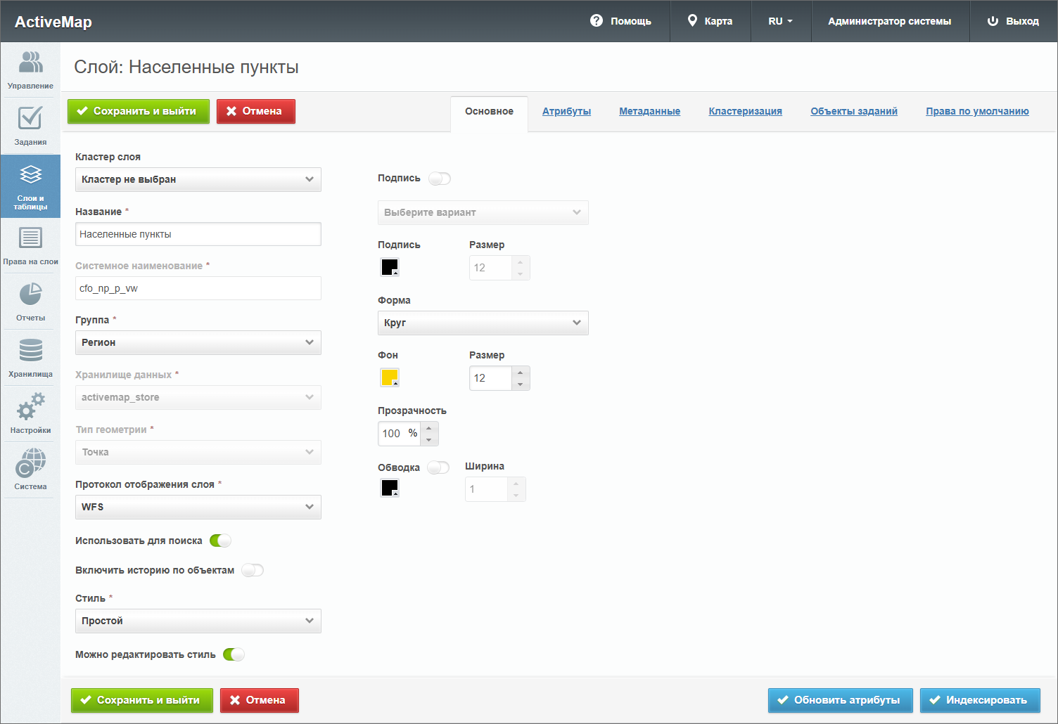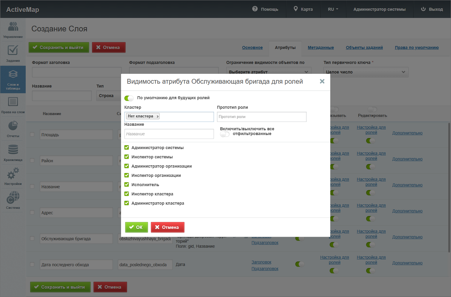 – откроется окно создания слоя, содержащее вкладки: «Основное», «Атрибуты», «Объекты заданий» и «Права по умолчанию». Дополнительно может присутствовать вкладка «Метаданные».