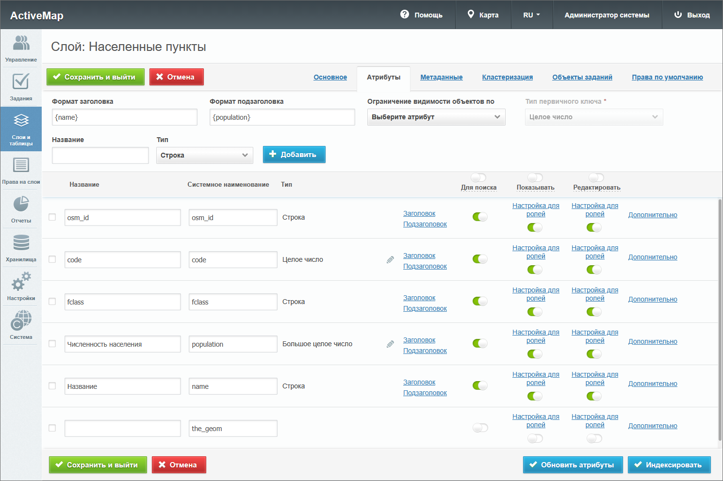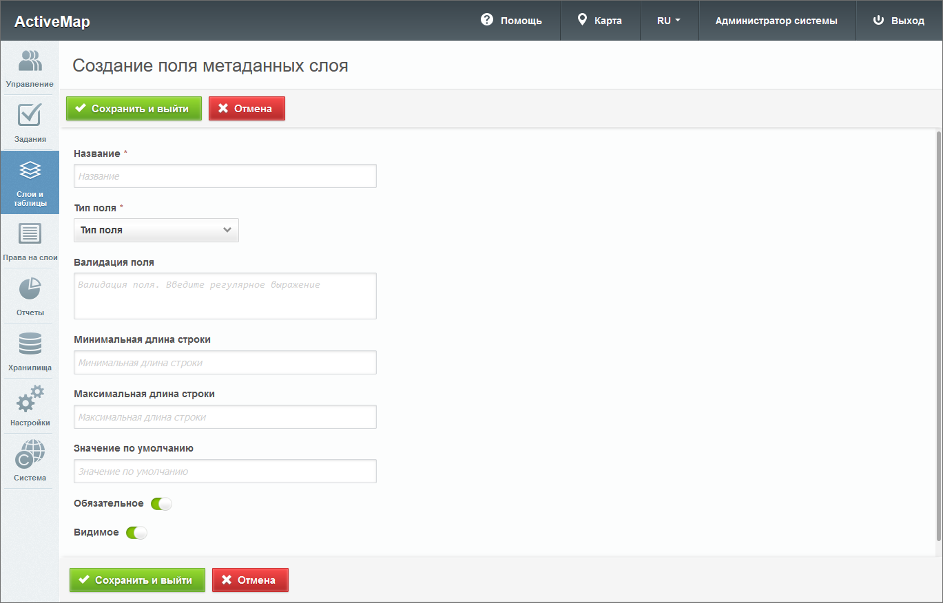«Видимое» – флаг отображения поля во вкладке «Метаданные» при создании или редактировании слоя, а также в информационном окне в клиентской части сайта.