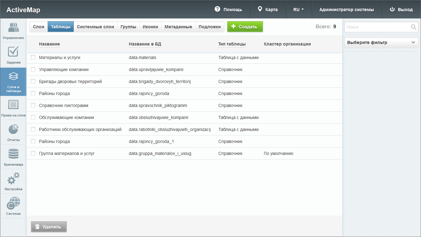 Блок «Слои и таблицы» предназначен для работы с картографическими слоями системы, таблицами и их группами. При переходе во вкладки «Слои», «Таблицы», «Системные слои», «Группы», «Иконки», «Метаданные», «Подложки» администратору становятся доступны следующие элементы управления: сортировка таблиц, поисковая строка, фильтры, добавление новой записи, редактирование записи, удаление записи, экспорт данных (Рис. 2.116).