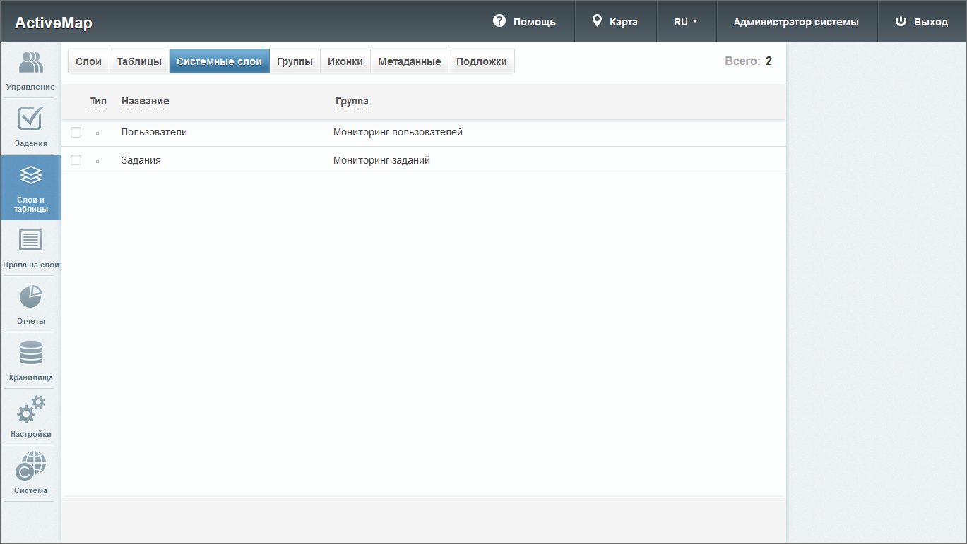 При переходе во вкладку «Слои» в окне администрирования становится доступна таблица со следующими графами (Рис. 2.116):