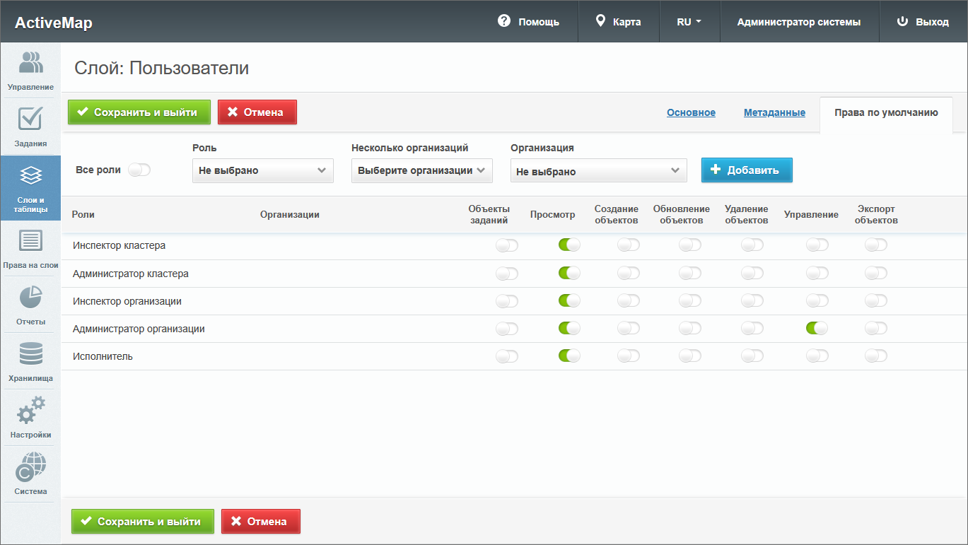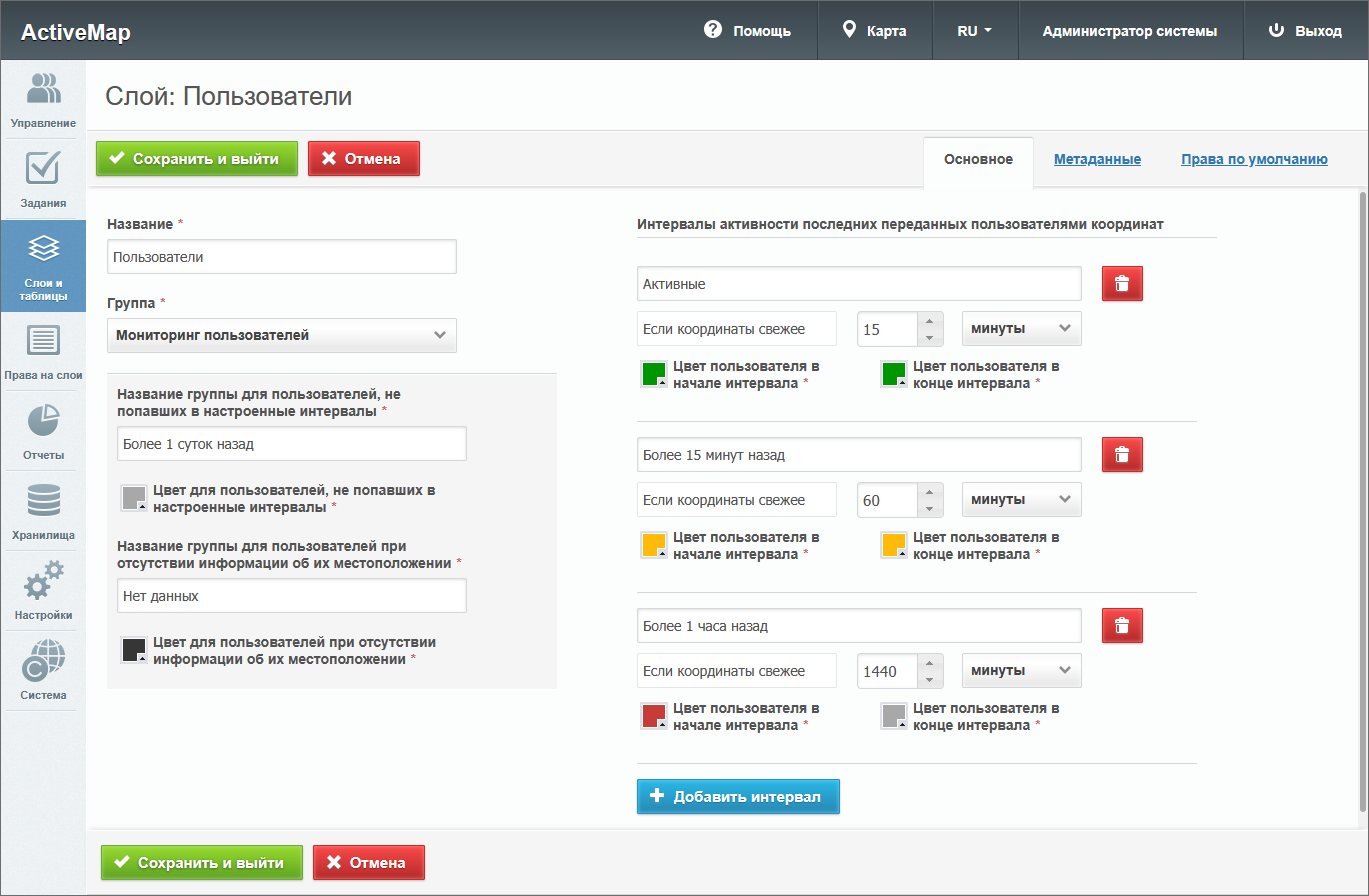 При редактировании группы в области администрирования открывается новое окно со следующими вкладками: основное, слои и таблицы.