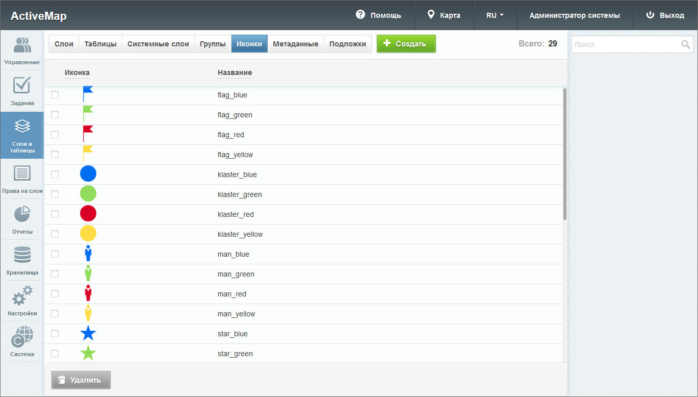 При переходе во вкладку «Иконки» администратору становится доступна таблица со следующими графами: иконка и название (Рис. 2.150). Иконки могут быть использованы при создании стилей, а также при добавлении кластеризации к точечным слоям (подробнее о кластеризации в разделе Редактирование слоя).