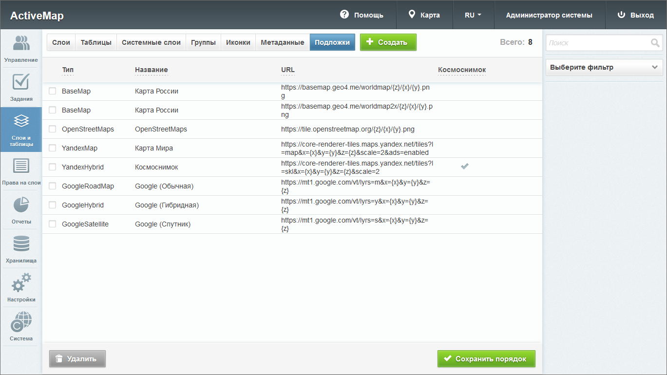 Подложка карты (базовый слой, базовая карта) — это слой, который является главным или основным в конкретной карте. Пользователи обычно «накладывают» свои собственные данные на базовую карту. При переходе во вкладку «Подложки» администратору становится доступна таблица подложек с графами (Рис. 2.153):