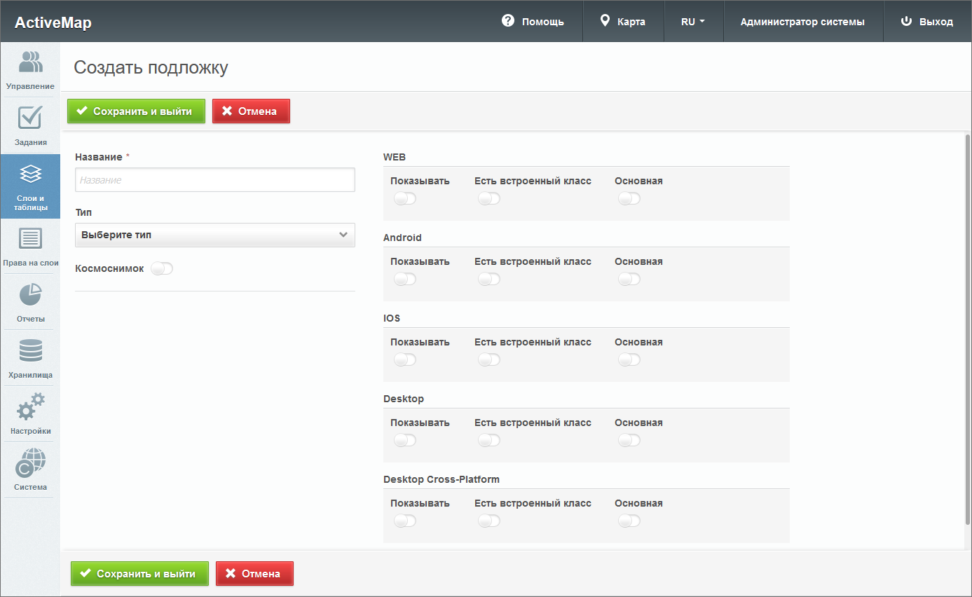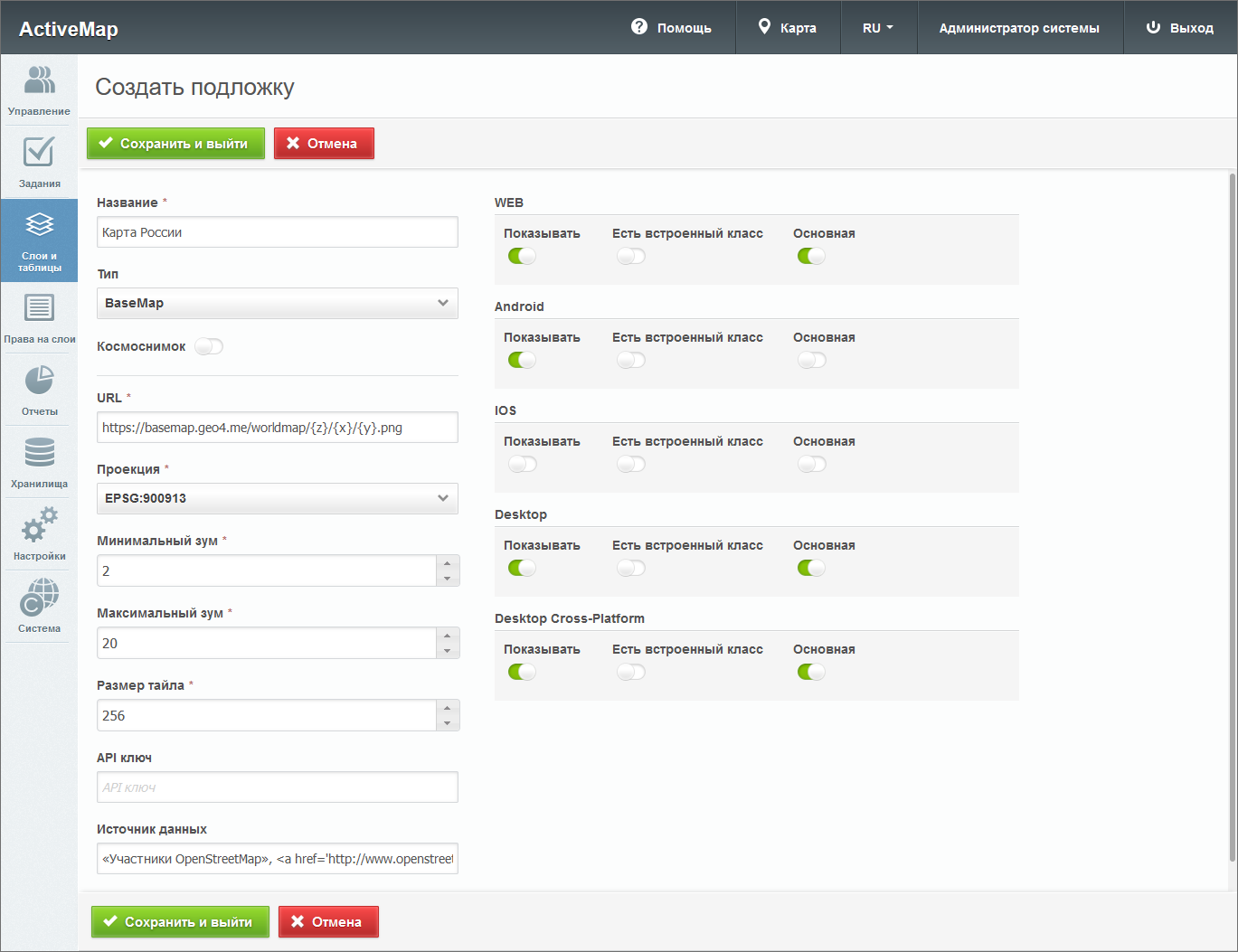 В правой части окна создания находятся настройки отображения подложки в различных приложениях (компонентах) системы: WEB («MapSurfer»), Android («ActiveMap Mobile» Android), IOS («ActiveMap Mobile» IOS), Desktop («ActiveMap Messages»), Desktop Cross-Platform («ActiveMap Messages» Cross-Platform).