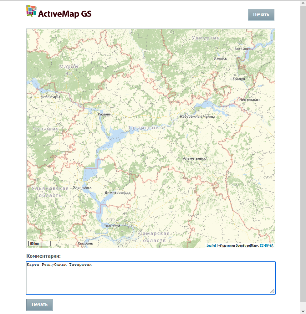 При нажатии на данную кнопку откроется новое окно, где можно выбрать масштаб и положение карты. Также пользователь может добавить комментарий к карте, который будет сохранен и в печатной версии (Рис. 2.37).
