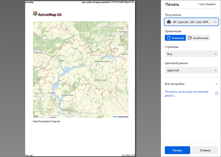 После нажатия на «Печать» принтер напечатает карту в том виде, в котором она была на экране на момент вызова мастера печати.