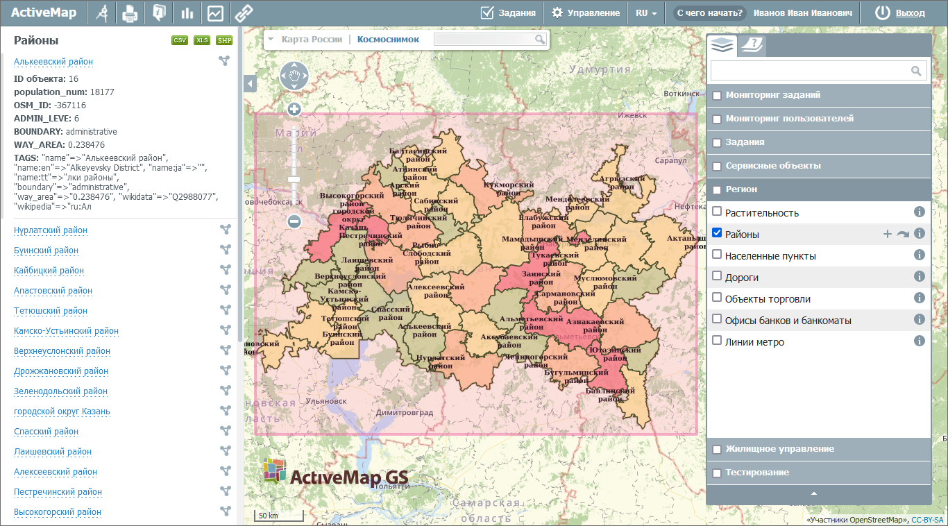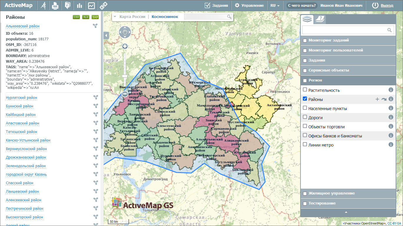 Данные по слоям могут быть выгружены в xls-, csv- и shp-формате при
