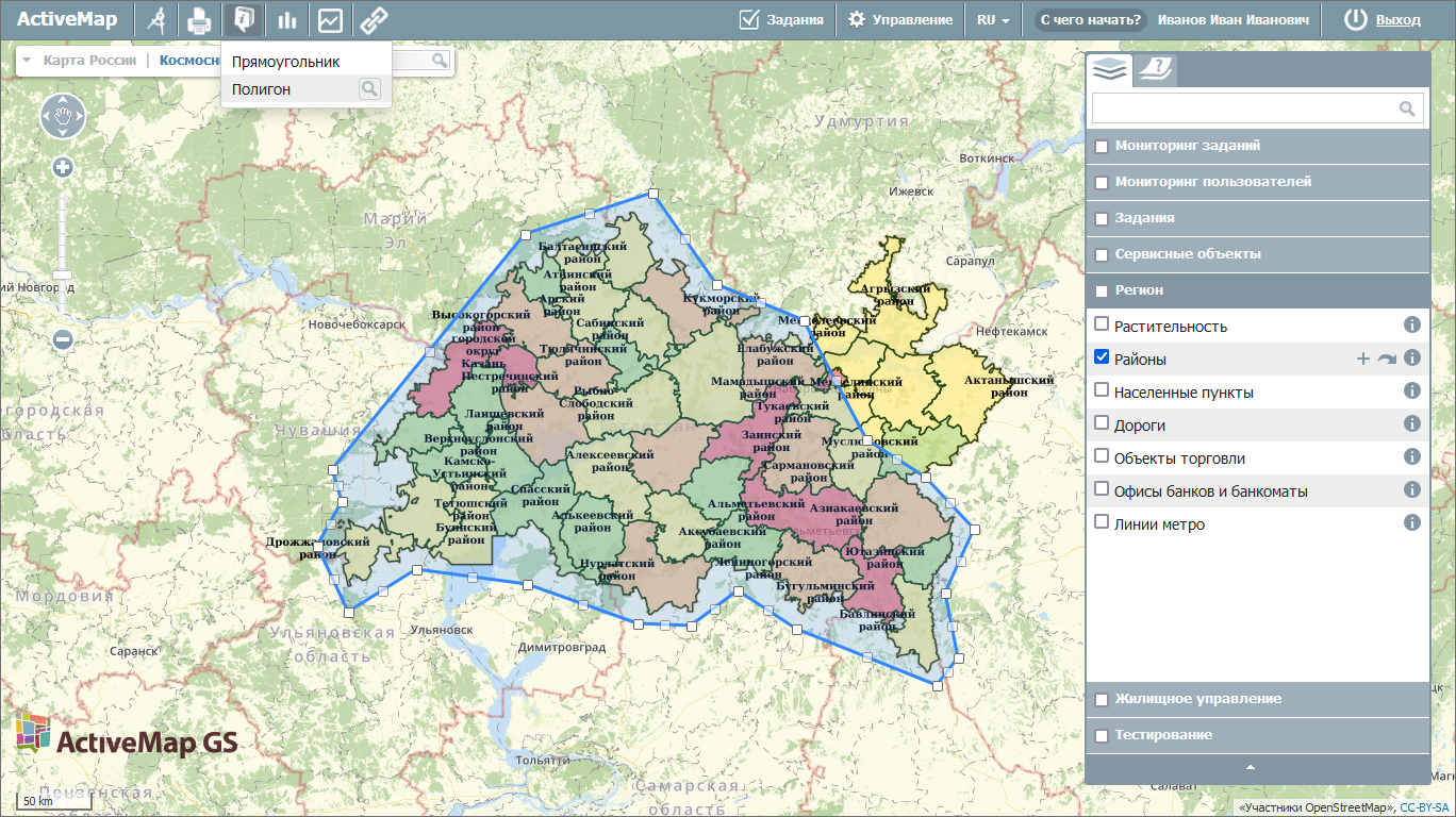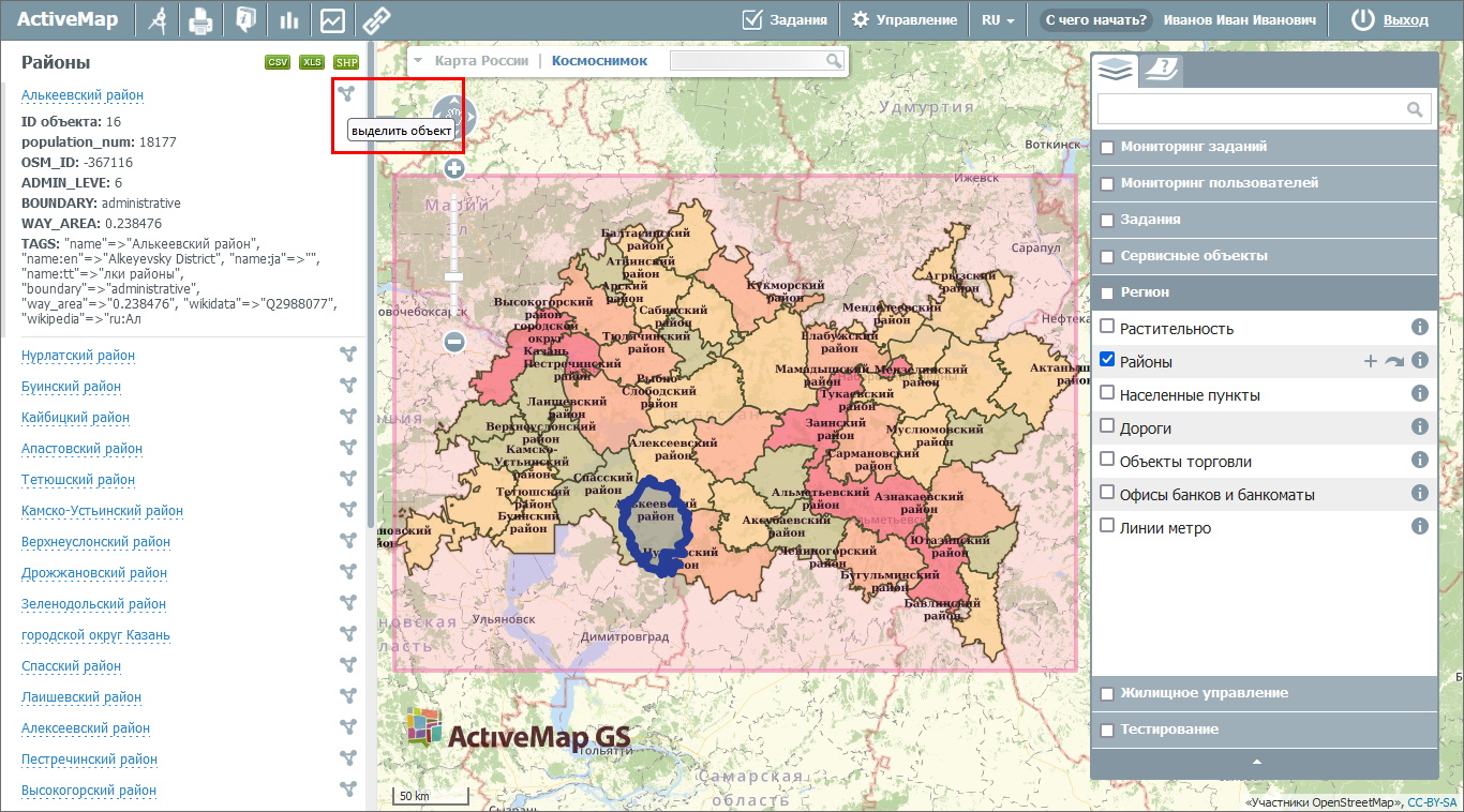 и выбрать тип выделения: прямоугольник или произвольный полигон. Для выделения интересующего участка прямоугольником следует зажать левую кнопку мыши и потянуть в сторону. В левой части страницы откроется окно с перечнем объектов,