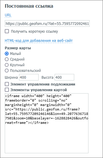 При создании HTML-кода для добавления на веб-сайт можно выбрать следующие параметры: размер карты, ширину и высоту, а также решить, будут ли отображаться элементы управления базовыми слоями и элементы управления картой (Рис. 2.47).