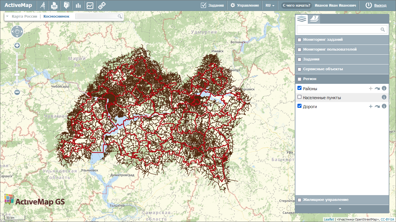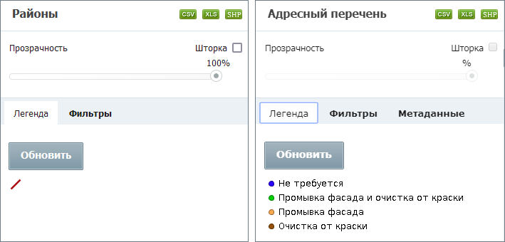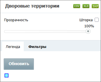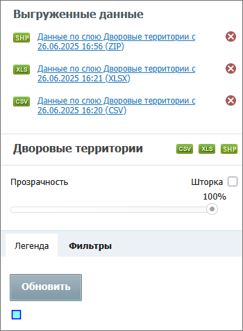 отображаются при наличии у пользователя прав на управление слоем. Поддерживается экспорт данных слоя в следующие форматы: