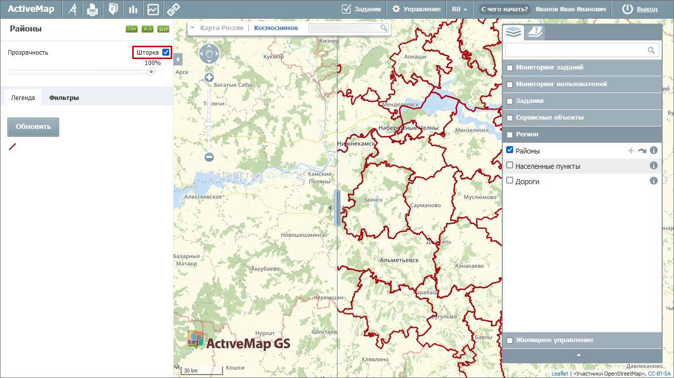 Инструмент «Шторка» позволяет скрыть часть активного слоя в окне карты. Управление вертикальной шторкой осуществляется с помощью курсора. Перемещая курсор в окне карты (влево/вправо), пользователь ограничивает область вывода активного слоя. Эта функция удобна для проведения визуального анализа различий на изображениях одной и той же территории. Для отключения функции требуется снять галочку в поле «Шторка» (Рис. 2.21).