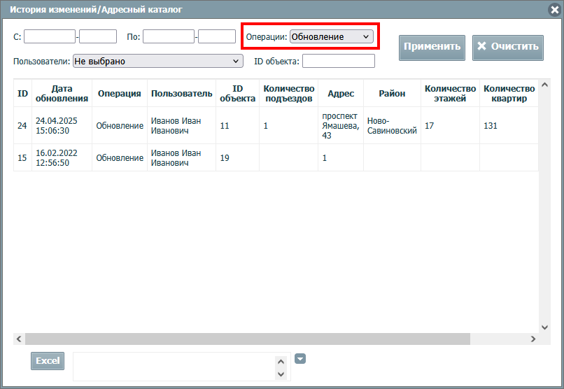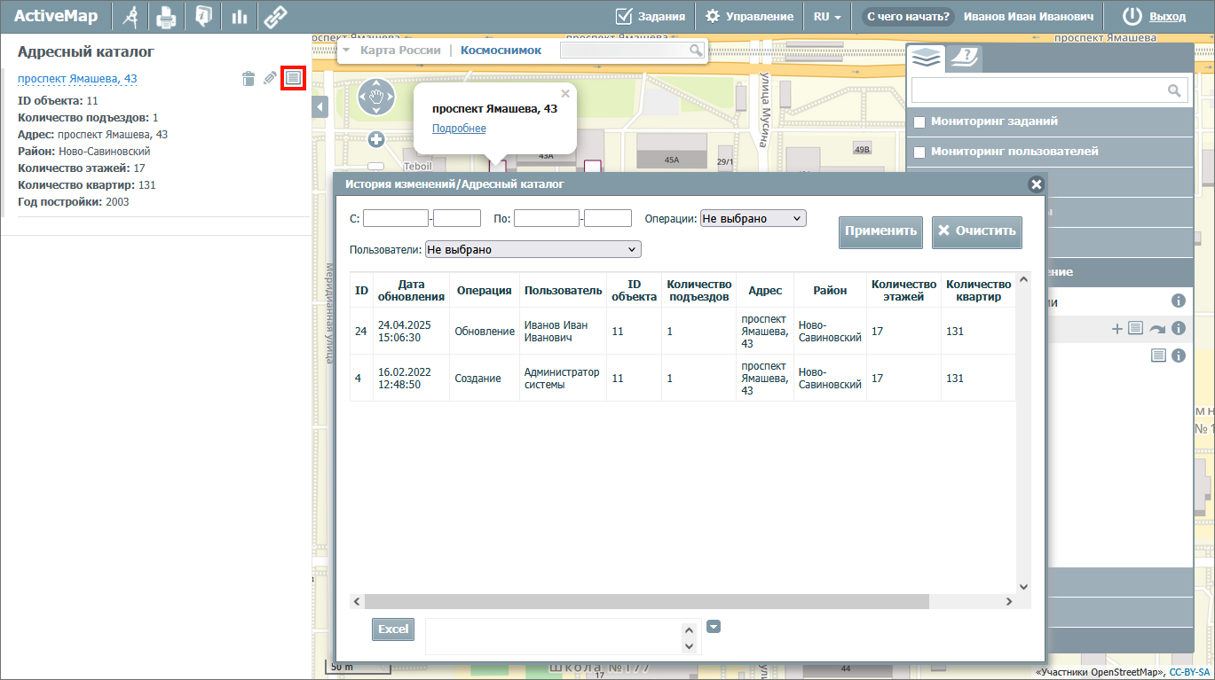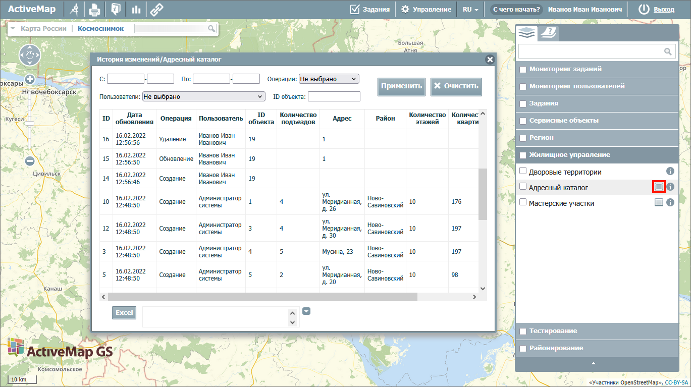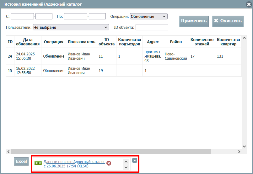 Историю изменений слоя можно выгрузить из системы в формате Excel. Данные выгружаются с учетом установленных фильтров. Для экспорта истории изменений следует нажать кнопку