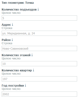 После создания геометрии объекта следует заполнить атрибутивные поля. При нажатии на «i» справа от названия поля выйдет подсказка с указанием типа вводимых данных (Рис. 2.29).