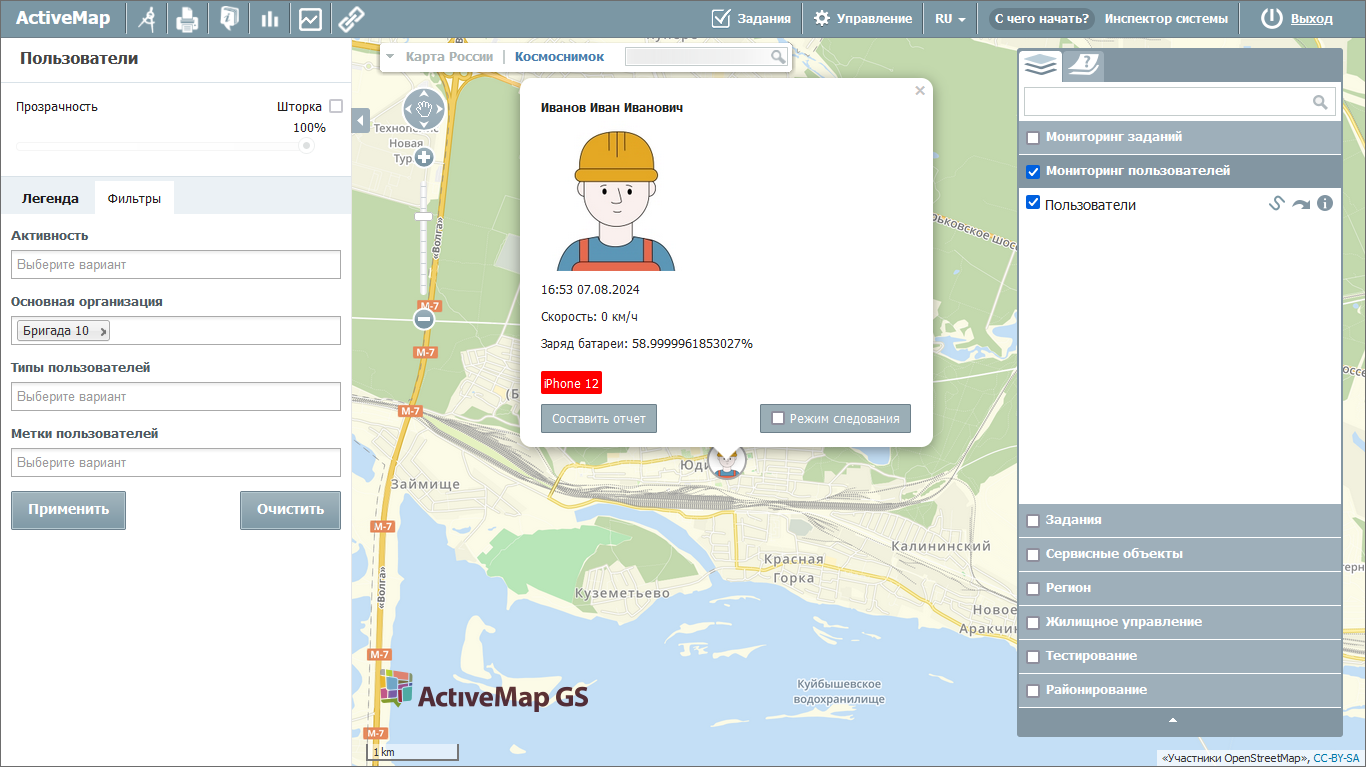 В этом же окне можно запустить создание отчета по передвижению данного пользователя за временной промежуток не больше недели и включить режим следования за пользователем на карте при его движении. К форме отчета по передвижению пользователей также можно перейти, нажав на иконку