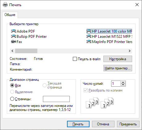 Настройки печати можно произвести и в стандартном окне печати Windows, которое появляется при нажатии на строку «Печатать, используя системный диалог» (Рис. 2.43).