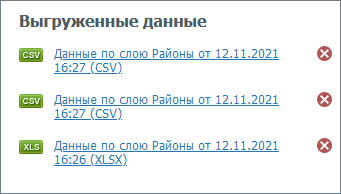 Данные по слоям могут быть выгружены в xls-, csv- и shp-формате при