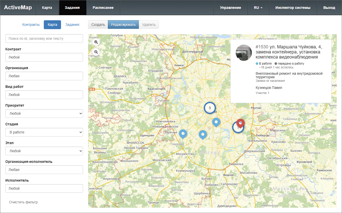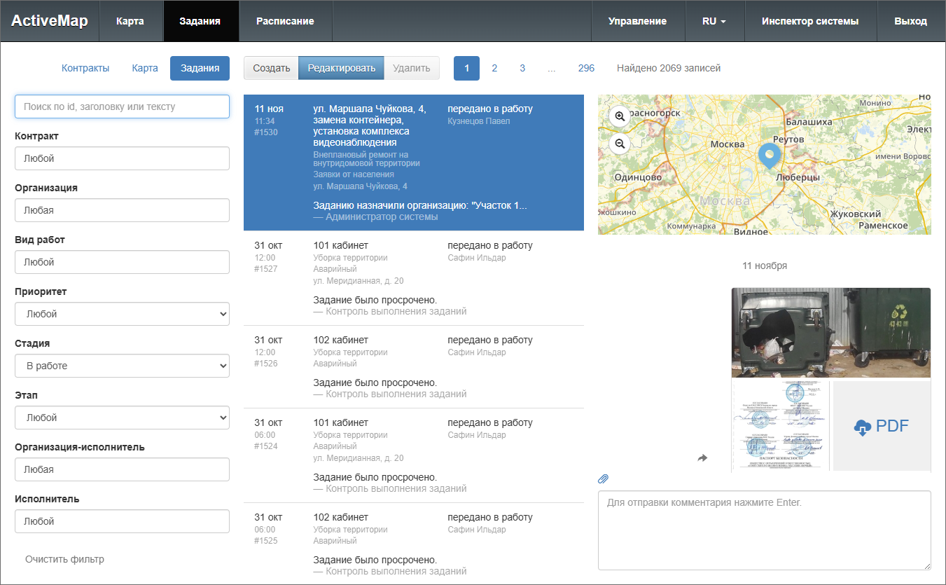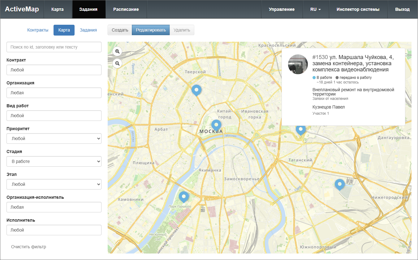 Для поиска задания достаточно ввести в поле контекстного поиска часть его номера, заголовка (названия) или описания. Для фильтрации заданий по стадии, виду работ, этапу, приоритету, организации, организации-исполнителю и исполнителю необходимо выбрать значения из выпадающего списка. После ввода и выбора параметров фильтрации на карте отобразятся задания, удовлетворяющие заданным критериям.