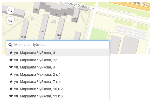 и/или мыши и щелкнуть по карте. Кроме того, можно ввести в поисковую строку адрес объекта. Результаты поиска отобразятся в виде списка. При наведении курсора на каждый из них Программа переместится к указанному адресу на карте (Рис. 2.60). Если задание не привязано к конкретному месту, геопозицию можно не указывать.