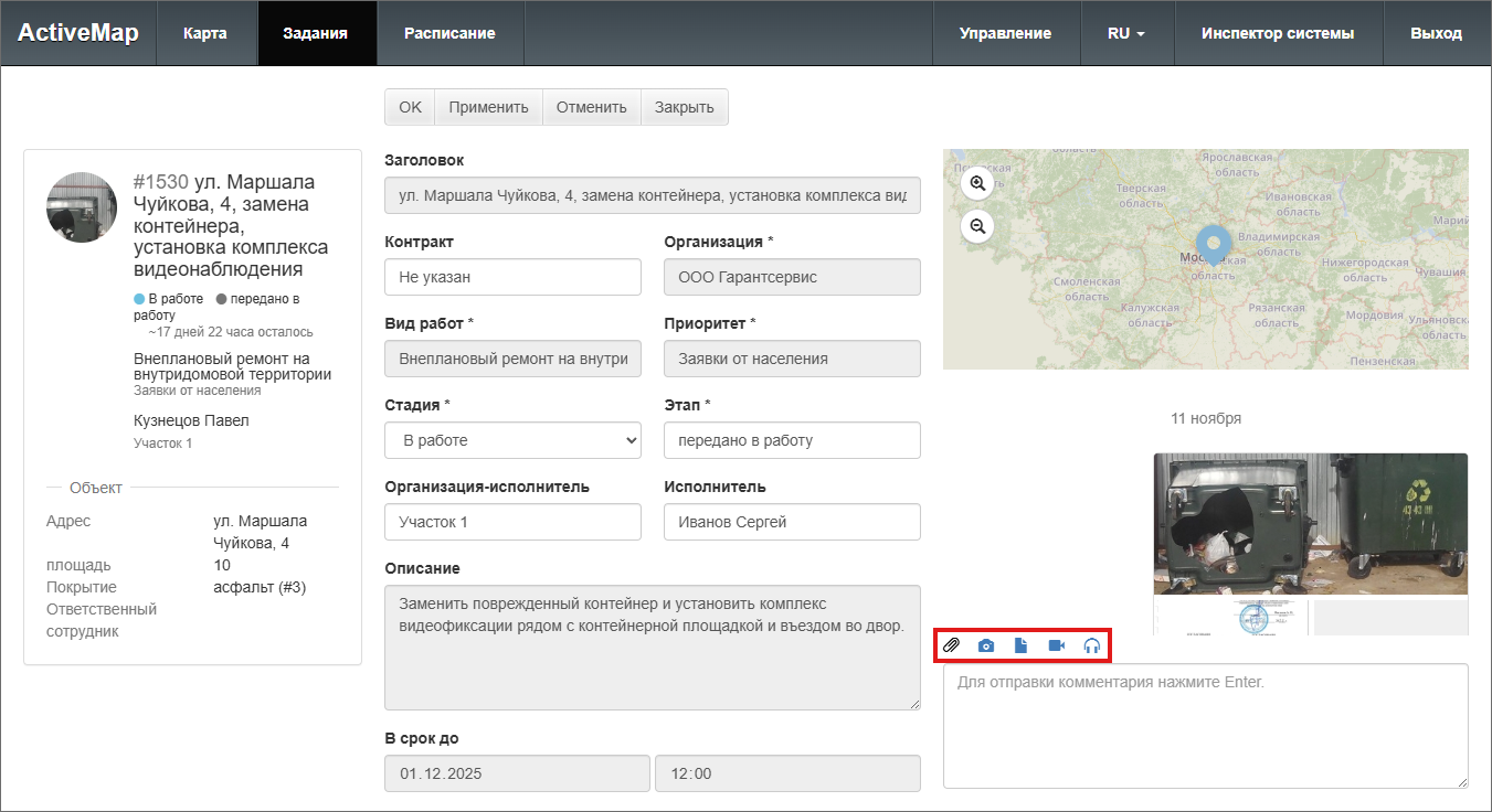Выбранный объект отобразится на карте в окне задания, поля задания будут заполнены согласно настроенному маппингу. Заполненные поля можно отредактировать, а также внести значения в пустые поля (поля, обязательные для заполнения, отмечены звездочкой) (Рис. 2.62):