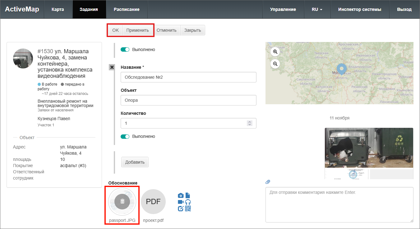 Во вкладке «Основное» отображается карта для указания местоположения объекта и поля для заполнения характеристик задания.
