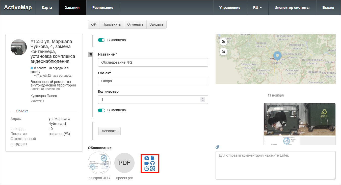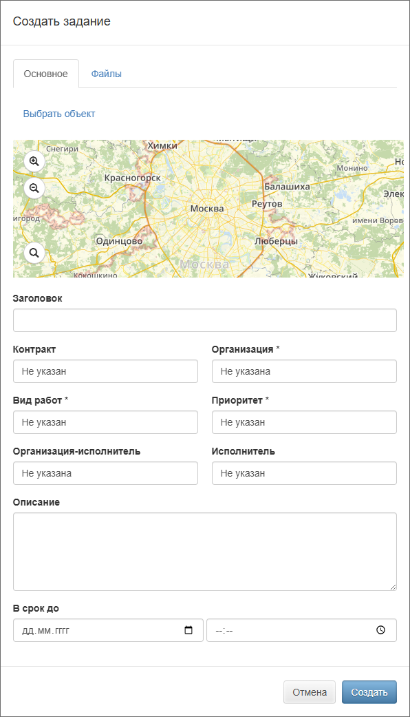 Во вкладке «Основное» отображается карта для указания местоположения объекта и поля для заполнения характеристик задания.
