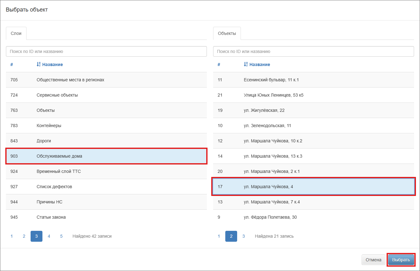 Задание можно привязать к объекту. Для этого следует нажать на строку «Выбрать объект», расположенную над картой. Откроется окно, где во вкладке «Слои» в левой части окна необходимо выбрать слой. После этого в правой части окна, во вкладке «Объекты» отобразятся объекты данного слоя. В каждой из вкладок можно воспользоваться строкой поиска. Следует выделить объект в списке, щелкнув по строке с его названием, и нажать кнопку «Выбрать» (Рис. 2.61).