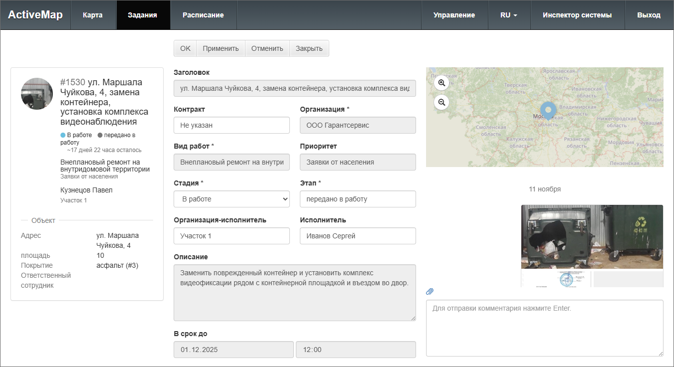 На карте доступен единичный выбор задания для просмотра подробной информации. При клике иконка задания окрасится красным, а в карточке задания отобразится следующая информация: id, заголовок, стадия, этап, срок выполнения, вид работ, приоритет, назначенная организация и исполнитель. Если задание было создано по расписанию, то отобразится также название расписания с возможностью перехода в режим редактирования расписания или шаблонов (Рис. 2.58).