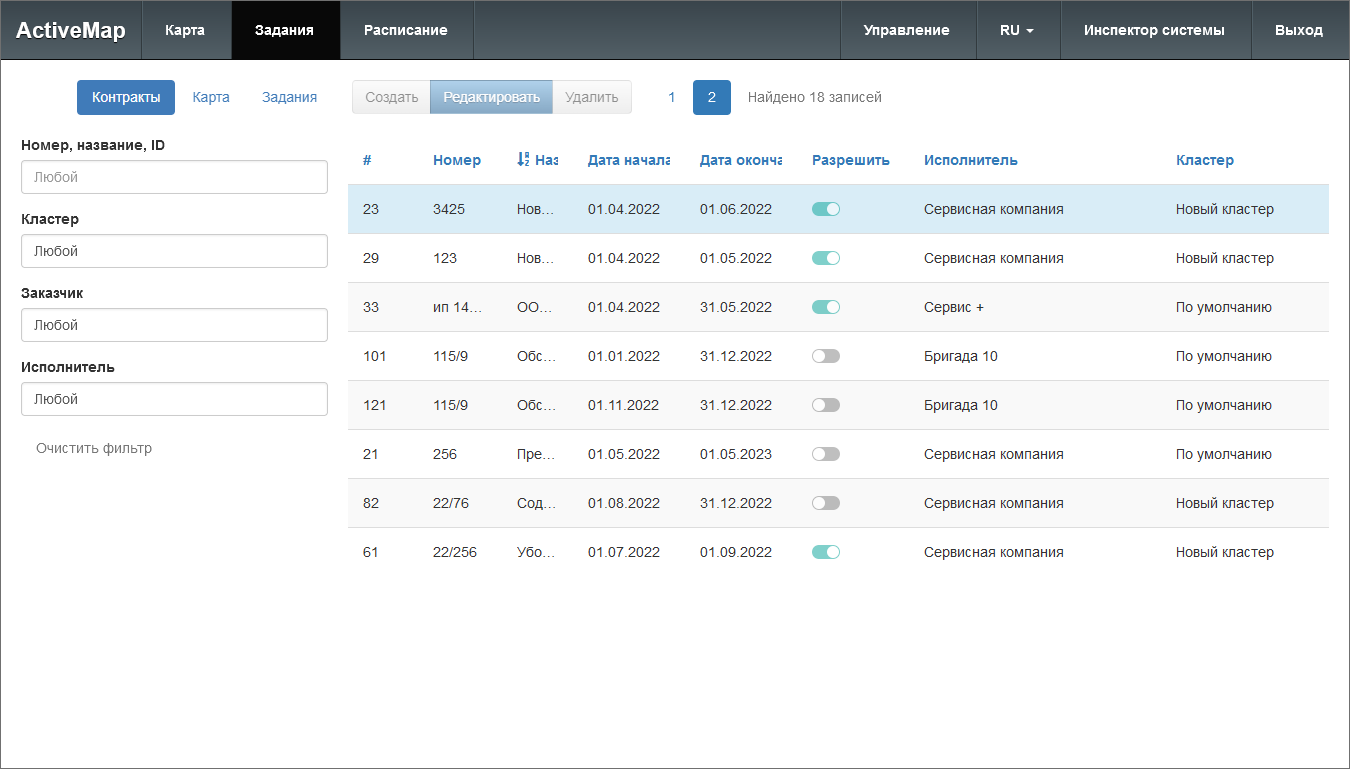 Контракт – договор на оказание услуг, заключенный с организацией, в рамках которого выполняется работа по заданию. Контракты могут создавать, редактировать и удалять пользователи с ролями администратора системы и администратора кластера. Контракты действуют в рамках кластера. Кластер выбирается автоматически, при создании используется кластер организации-заказчика. В другом кластере данный контракт будет недоступен для пользователей. Права на просмотр контракта есть у инспектора системы, инспектора кластера, администратора и инспектора назначенной организации. Исполнители, которые видят задание, созданное по контракту, также будут получать минимальную информацию (id, заголовок). Контракт может включать в себя перечень объектов и видов работ.