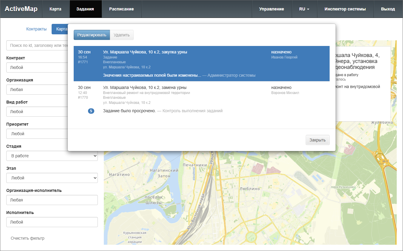 Так же, как и в окне карты заданий, в окне списка можно фильтровать, редактировать и удалять имеющиеся задания, а также создавать новые оперативные задания.